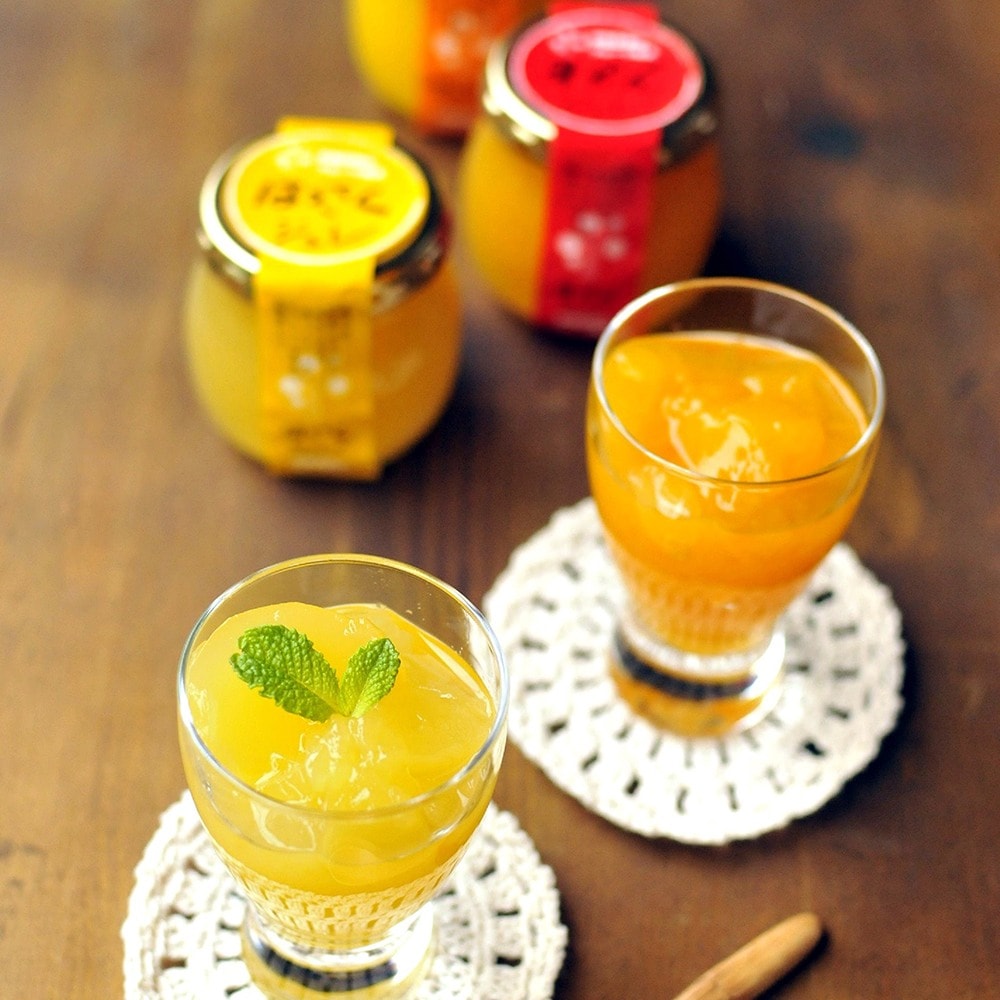 果肉だけがジュースになった100%ストレートジュースを原料としているため、とってもクリアな味。ぷるんぷるんの食感がたまらなく、柑橘そのものの特長をそのまんまゼリーにしました。