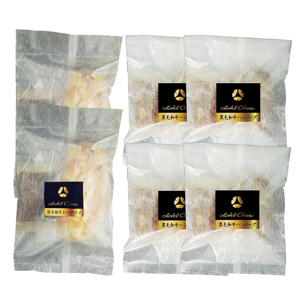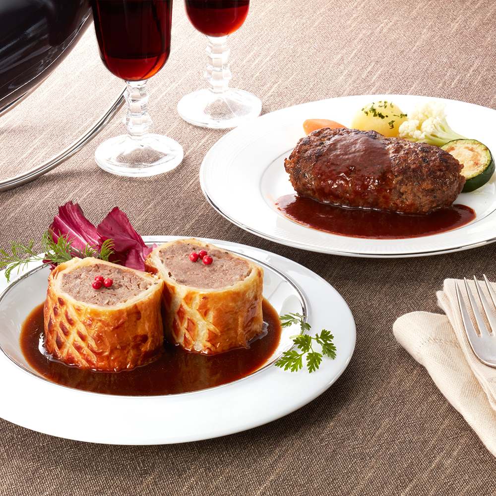 1962年の開業以来、「世界をもてなすホテルオークラ」を合言葉に、日本や世界の賓客をもてなし続けるホテルオークラ。黒毛和牛の存在感とおいしさを最大限に味わえるサクサクした食感のビーフパイと、黒毛和牛が持つ旨味と芳醇な香りをギュッと凝縮したハンバーグ の贅沢なセットです。
