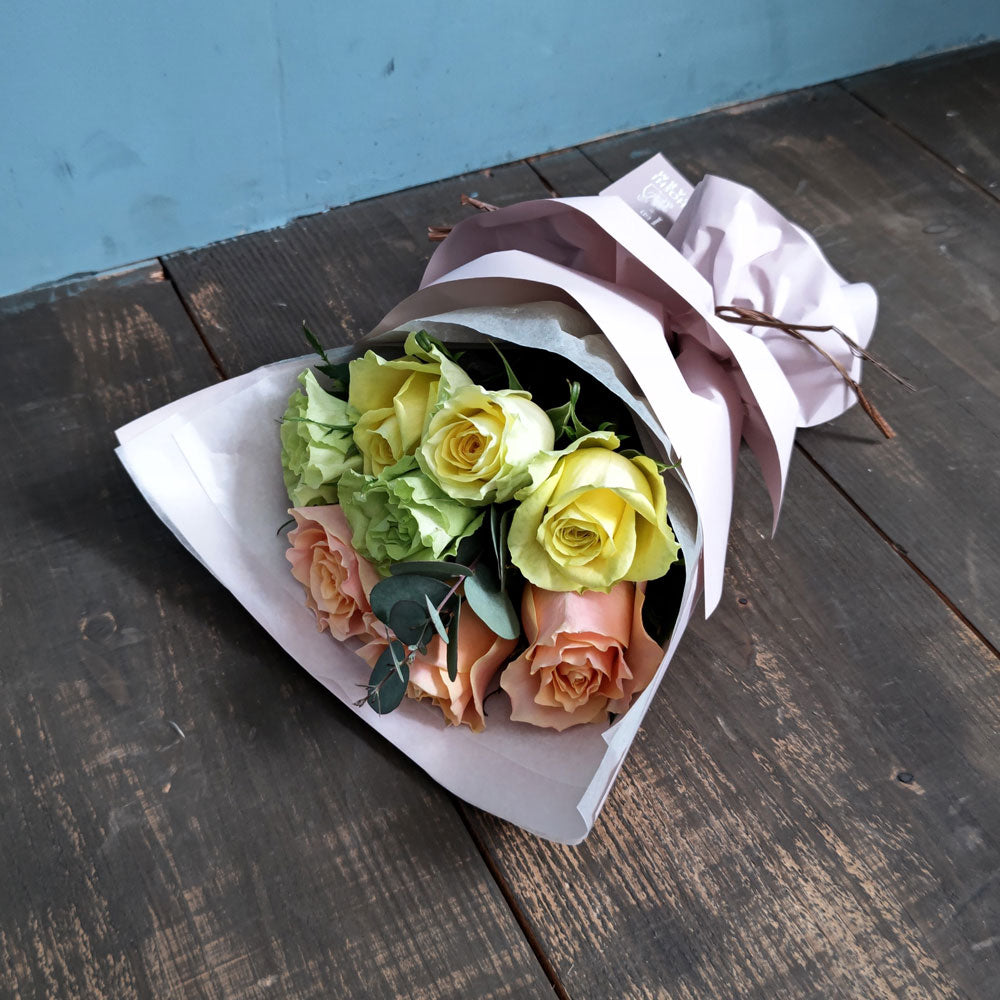 ■商品内容:お任せバラ(オレンジ・イエロー・グリーン系)×8本、栄養剤10ml(50倍希釈タイプ)、お手入れのしおり付き