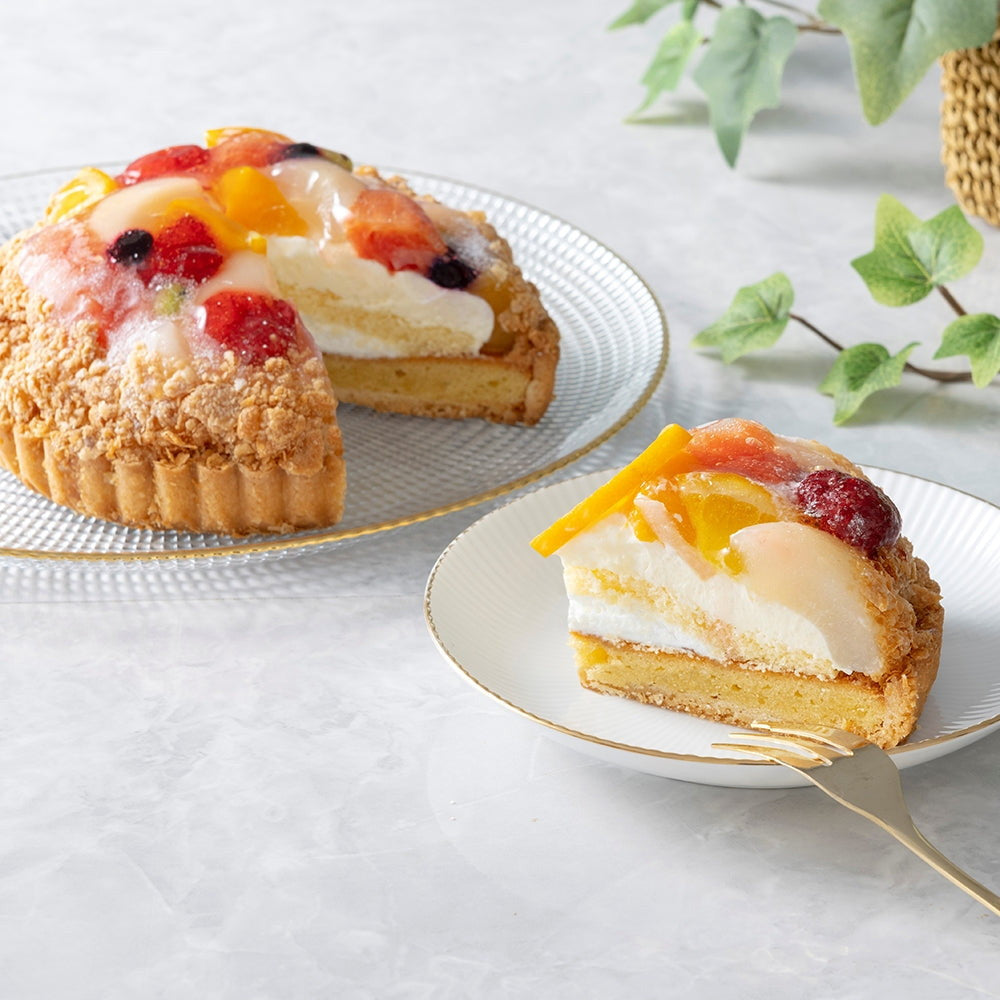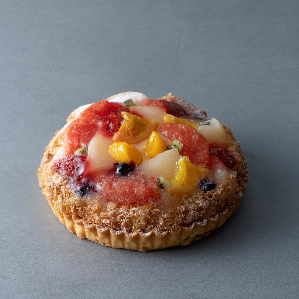 ■7種類のフルーツ(苺、黄桃、洋梨、オレンジ、キウイ、ピンクグレープフルーツ、ブルーベリー)をたっぷりと贅沢に盛り付けサクサクのパイを側面に散りばめたフルーツタルトです。