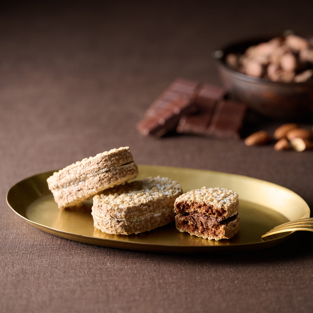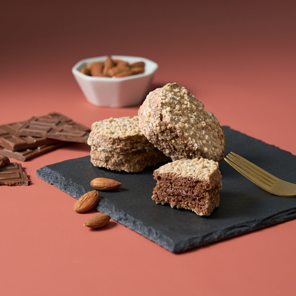 ■アーモンドパウダーの生地にさらにアーモンドダイスを入れることで、さっくりとした食感とともに、ショコラの風味豊かなクリームを楽しめるダックワーズです。