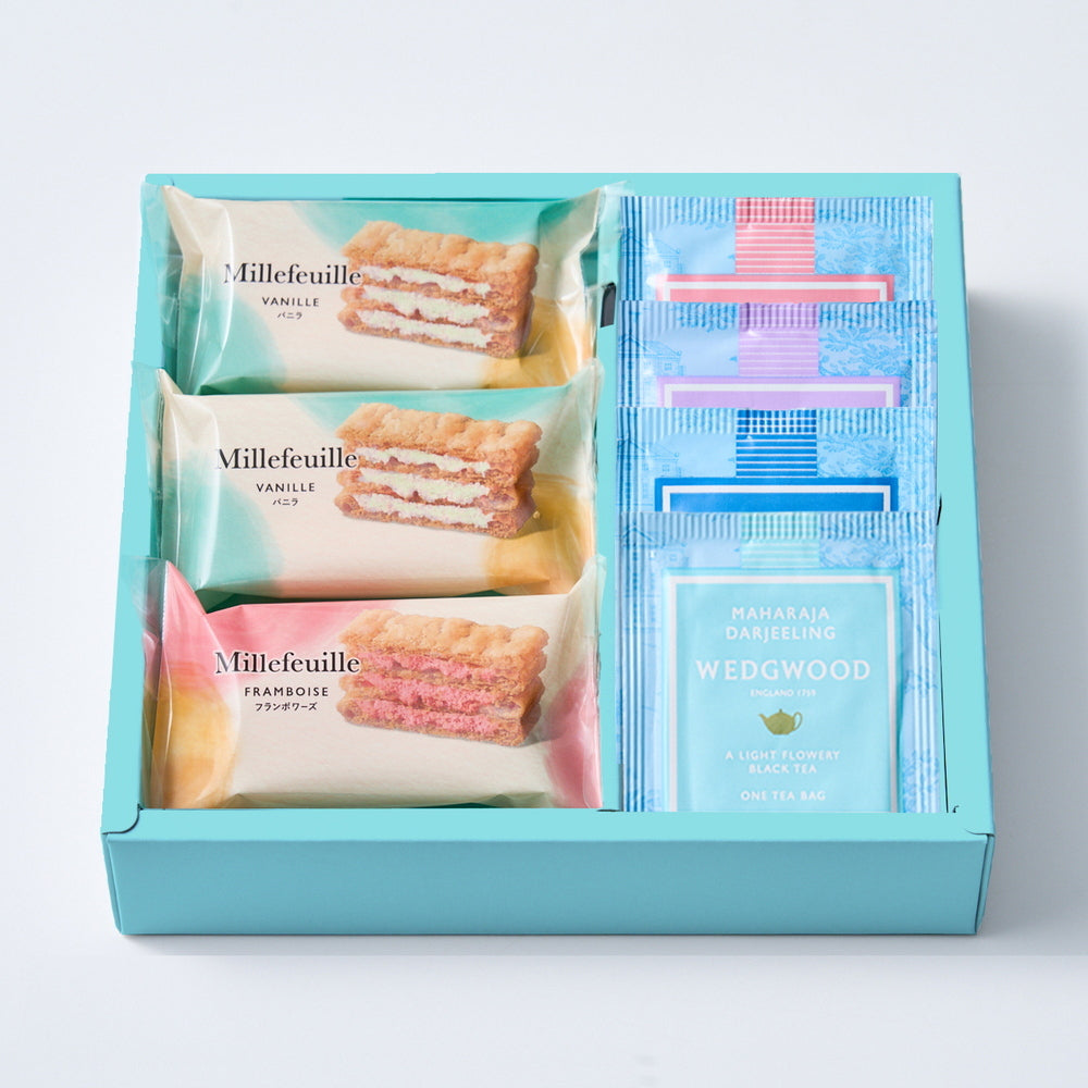 ■国産小麦100%のパイ生地に、バニラとフランボワーズの2種のクリームをサンドしたミルフイユと、ウェッジウッドの紅茶4種をセットにしました。サクサクのパイと風味豊かなクリーム、そして紅茶の芳醇な香りが口の中に広がる、贅沢なティータイムをお楽しみください。