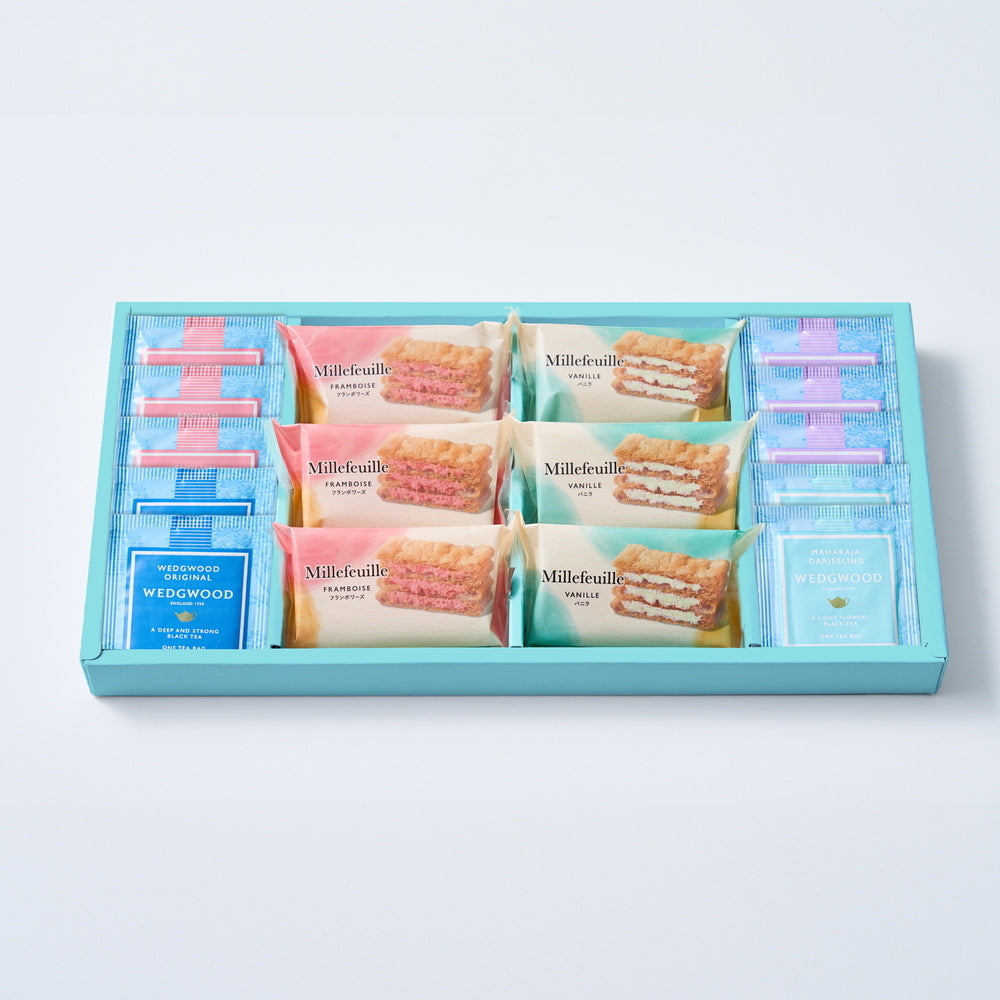 ■国産小麦100%のパイ生地に、バニラとフランボワーズの2種のクリームをサンドしたミルフイユと、ウェッジウッドの紅茶4種をセットにしました。サクサクのパイと風味豊かなクリーム、そして紅茶の芳醇な香りが口の中に広がる、贅沢なティータイムをお楽しみください。