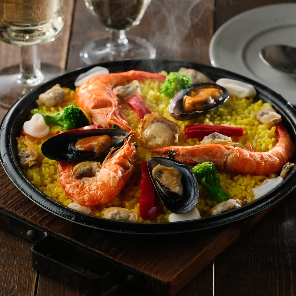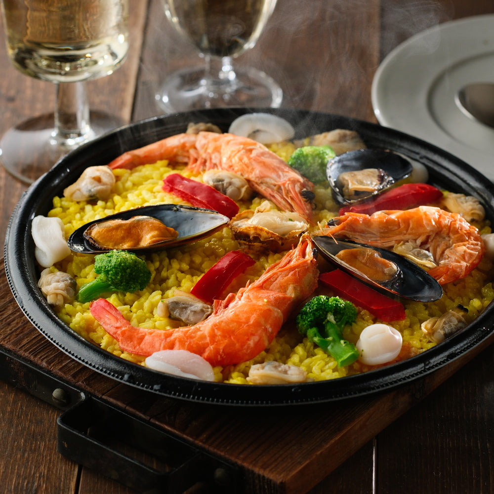 ■サフランライスの上に、殻ごと食べられる海老(ソフトシェルシュリンプ)、ほたて、いか、あさり、ムール貝、ブロッコリー、パプリカを丁寧にトッピング。電子レンジで加熱するだけで、食べやすさ・おいしさ・見ためが揃ったパエリアがお楽しみいただけます。