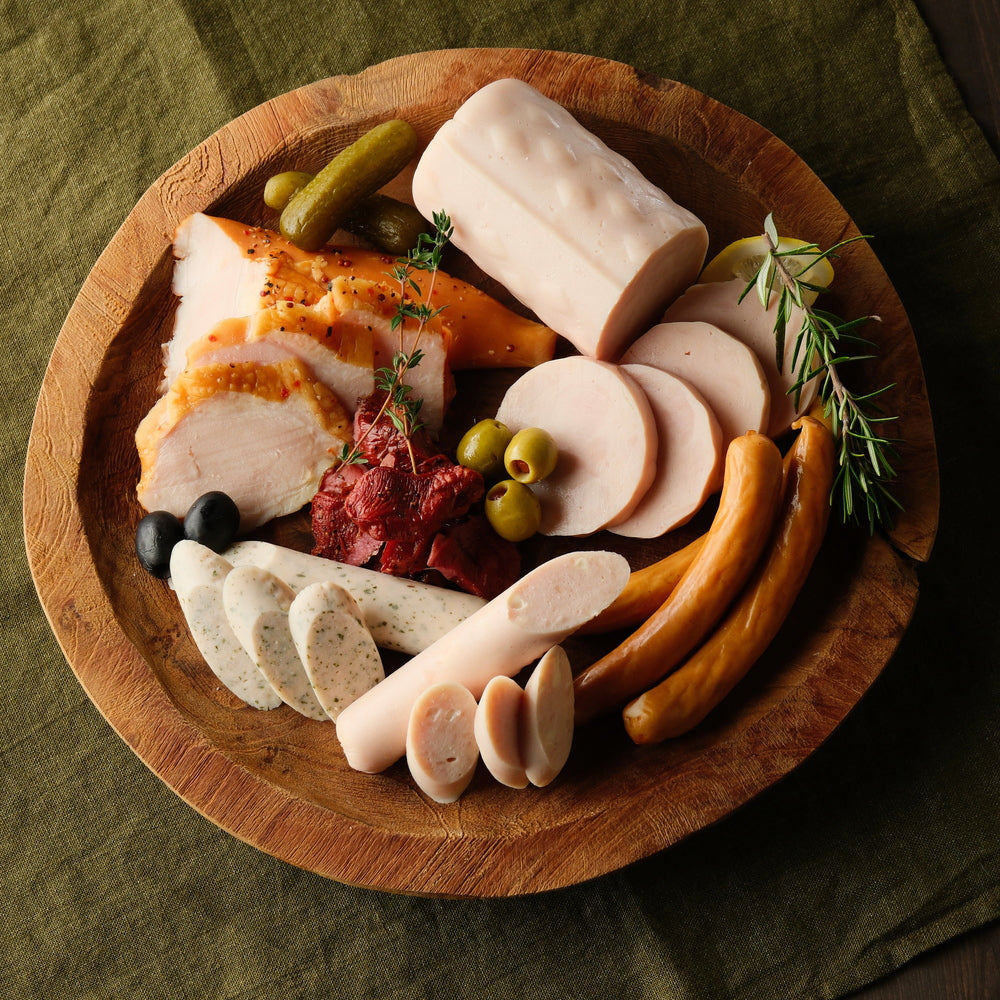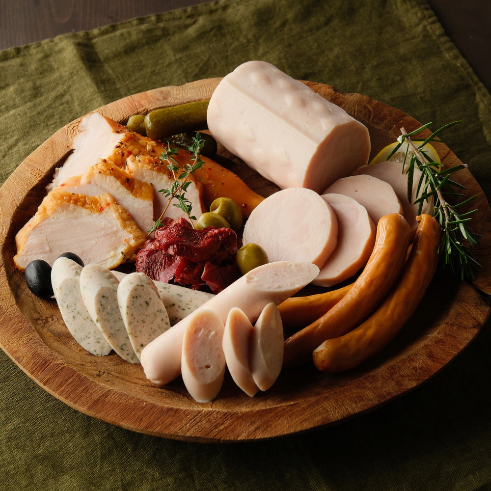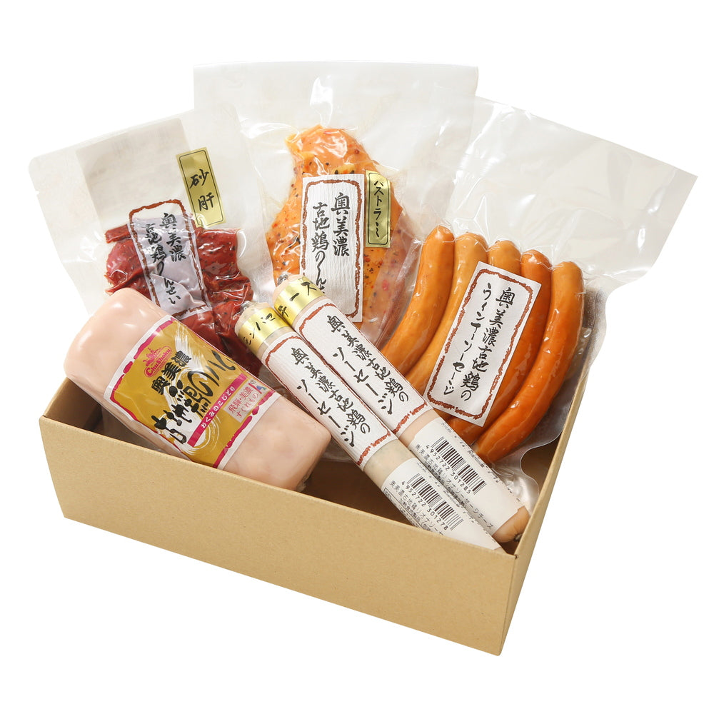 奥美濃古地鶏ハム360g、奥美濃古地鶏ウィンナー150g、奥美濃古地鶏むねパストラミ150g、奥美濃古地鶏砂肝燻製60g、奥美濃古地鶏リオナソーセージチーズ80g、奥美濃古地鶏リオナソーセージレモンパセリ80g