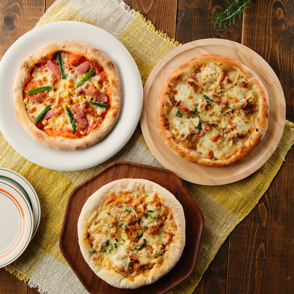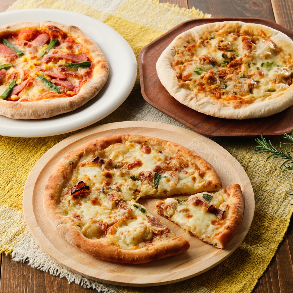 えびすもち豚のソーセージピザ300g、えびすもち豚と玉ねぎキムチのピザ260g、えびすもち豚の味噌ピザ260g