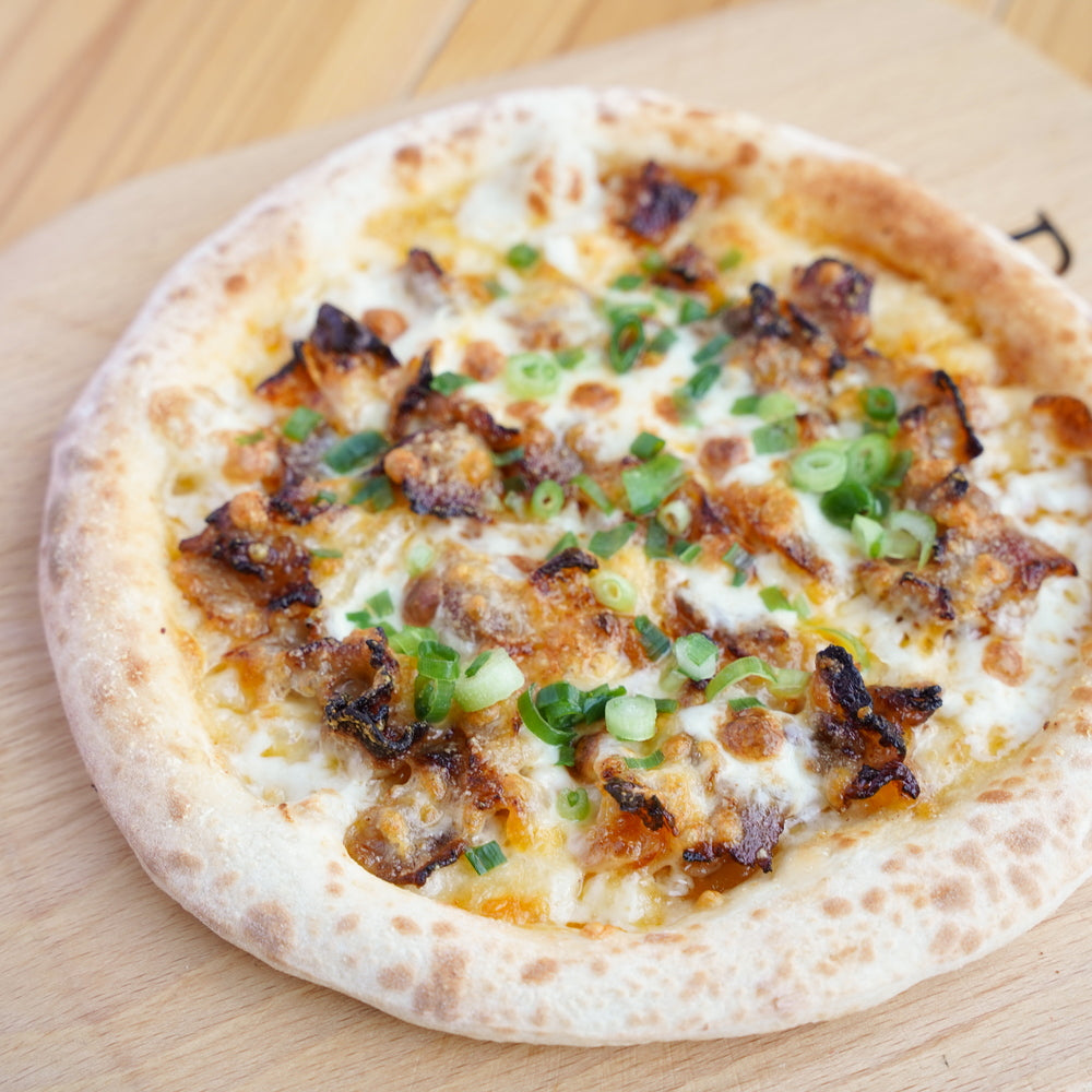 ■淡路島の食材・えびすもち豚にこだわった冷凍ピザで、生地はフランスパンベースで歯ごたえのあるもっちり系。淡路島特産の玉ねぎとの相性も抜群で、3枚それぞれ特色のある味をお楽しみいただけます。