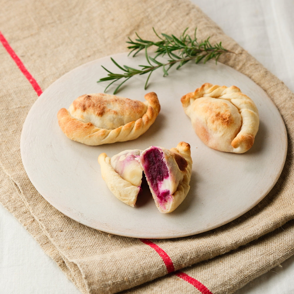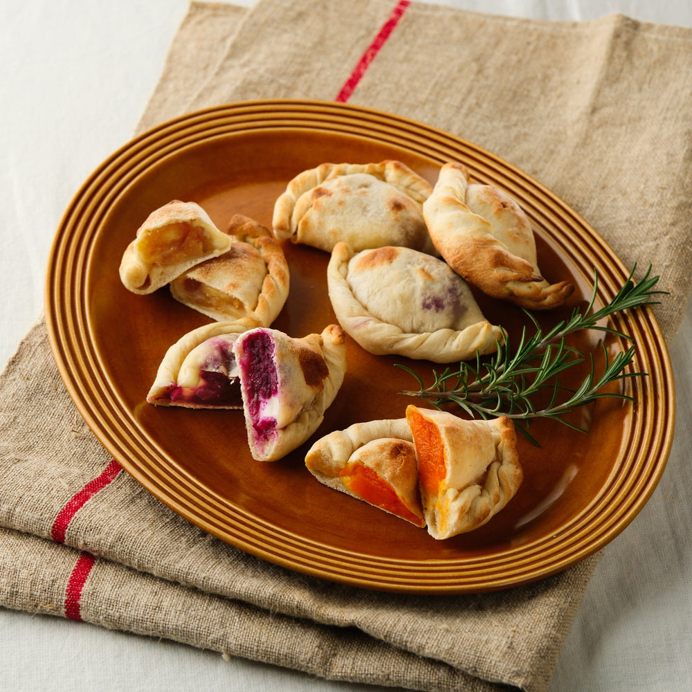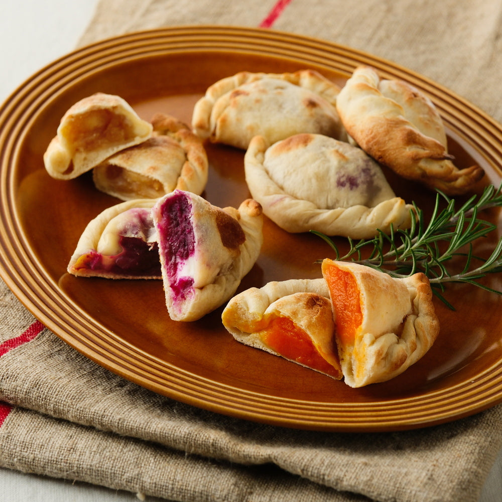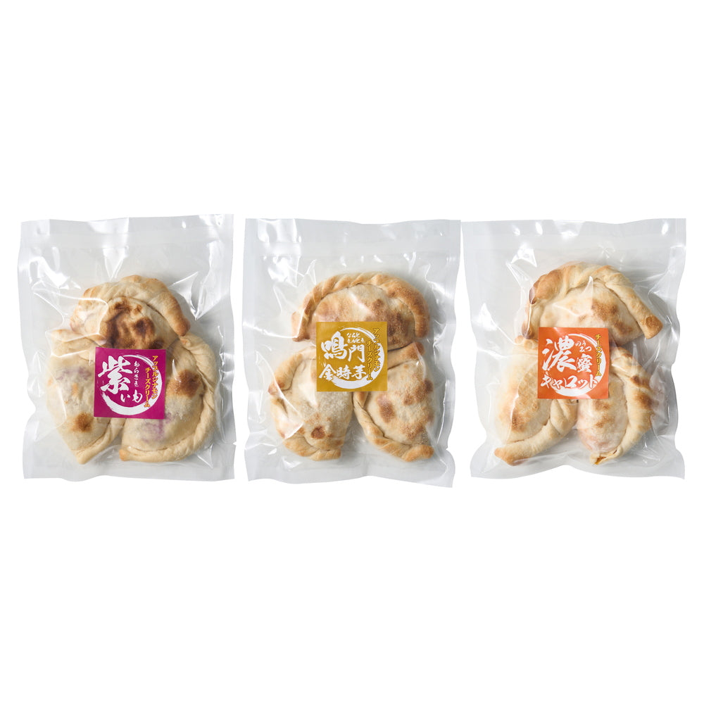 ■徳島を代表する鳴門金時をはじめ、色鮮やかな紫芋や濃厚な味わいの人参などの素材の持ち味を活かし、やさしい甘さのチーズクリームを加えて手包みで仕上げたカルツォーネピザ。300℃で一気に焼きあげて旨みを凝縮し、おいしさをそのままに-35℃で瞬間冷凍するため、電子レンジで温めるだけで作りたての味わいを楽しめる。