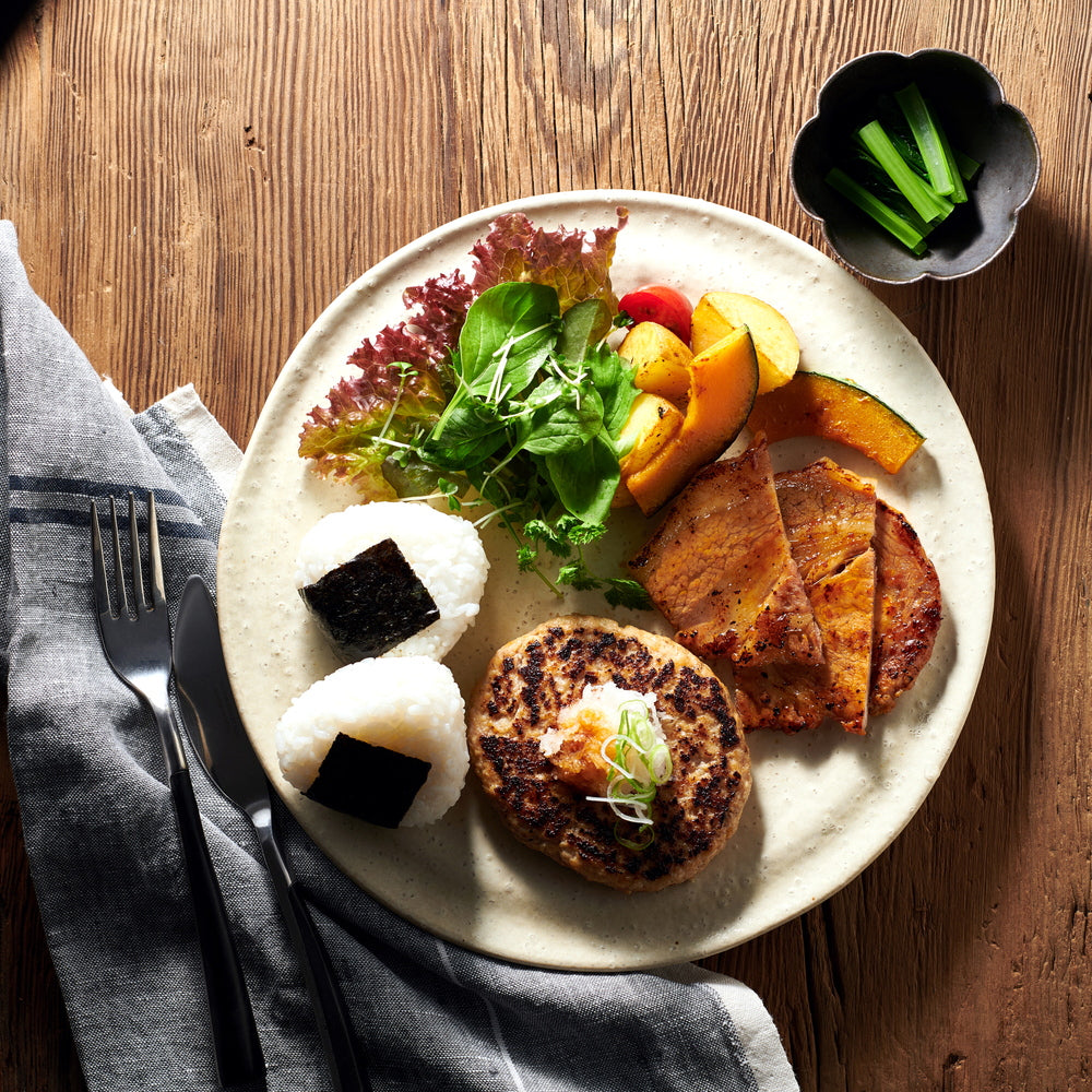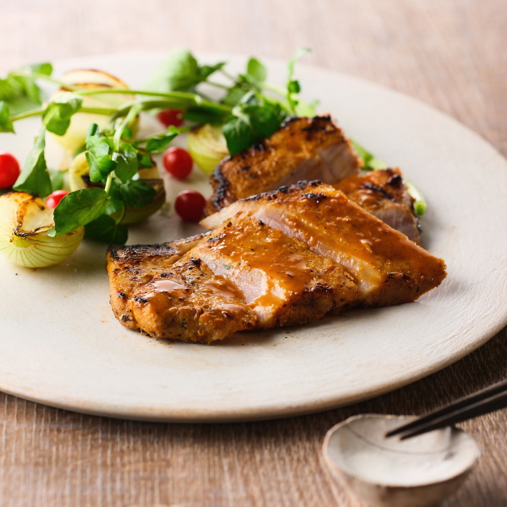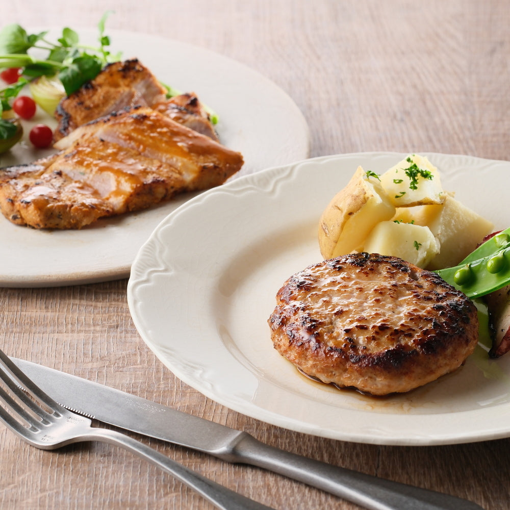 ■三重県産さくらポークは、指定された牧場で三元豚に加熱した植物性の飼料を与えて育てています。 ストレスなく健康に育ったさくらポークは脂に甘味があり、臭みが少ないのが特長です。そのさくらポークのロース肉を味噌漬にしました。味噌の香ばしさが豚肉の旨みを引き立てます。ハンバーグは、さくらポークを100%使用しました。ジューシーで肉汁たっぷりの素材にこだわったハンバーグとのセットをお楽しみください。