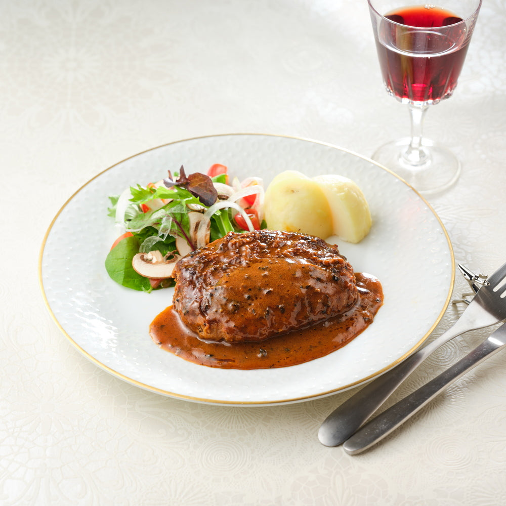■牛肉100%のやわらかなハンバーグに、黒トリュフを使用したデミグラスソースを合わせました。電子レンジで温めるだけでレストランの味がお楽しみいただけます。