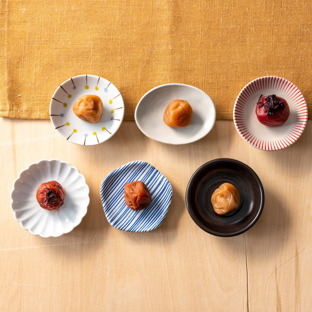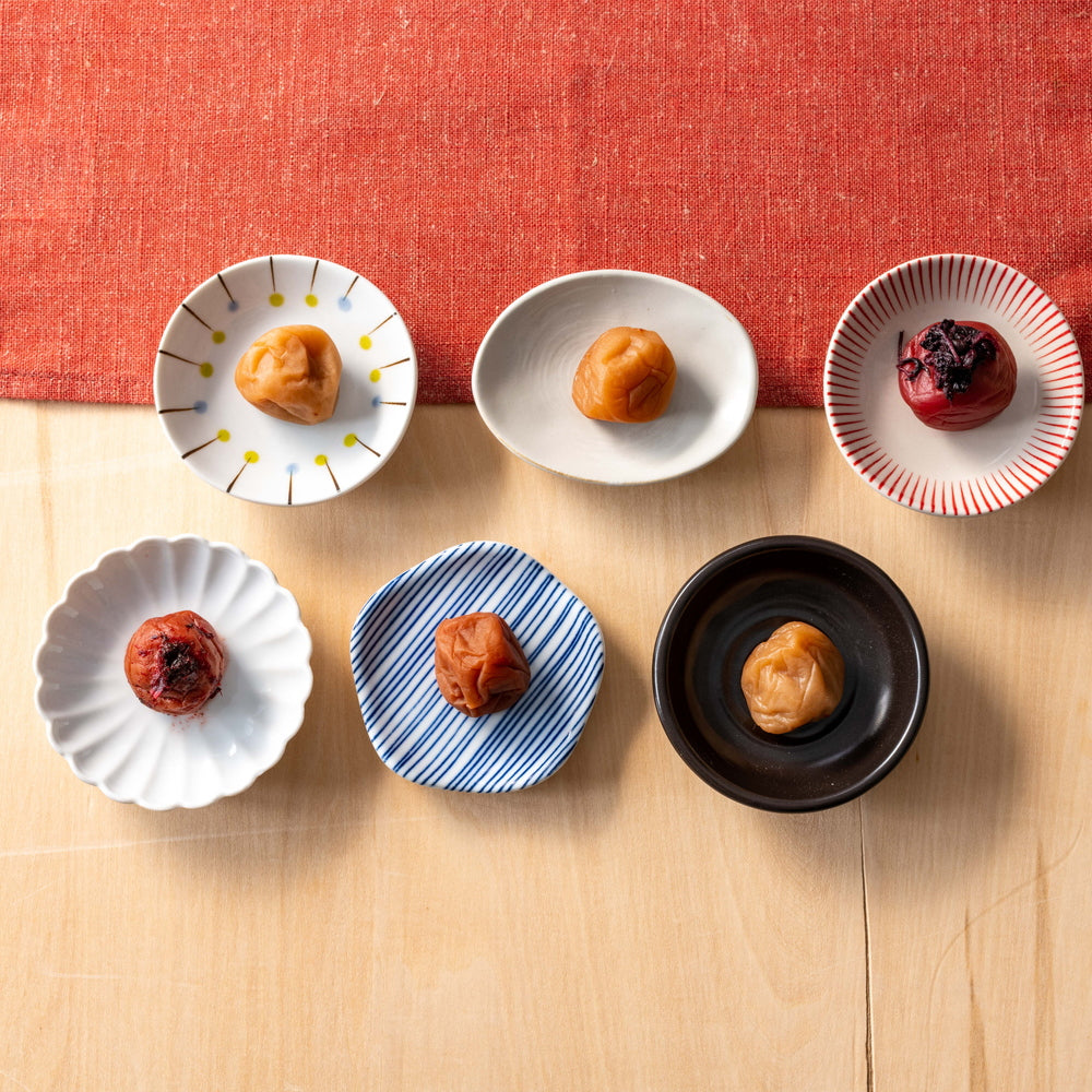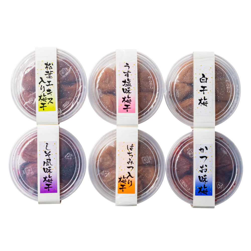松葉エキス入り梅干(塩分約14%)・うす塩味梅干(塩分約6%)・白干梅(塩分約20%)・しそ風味梅干(塩分約8%)・はちみつ入り梅干(塩分約8%)・かつお味梅(塩分約14%) 各80g