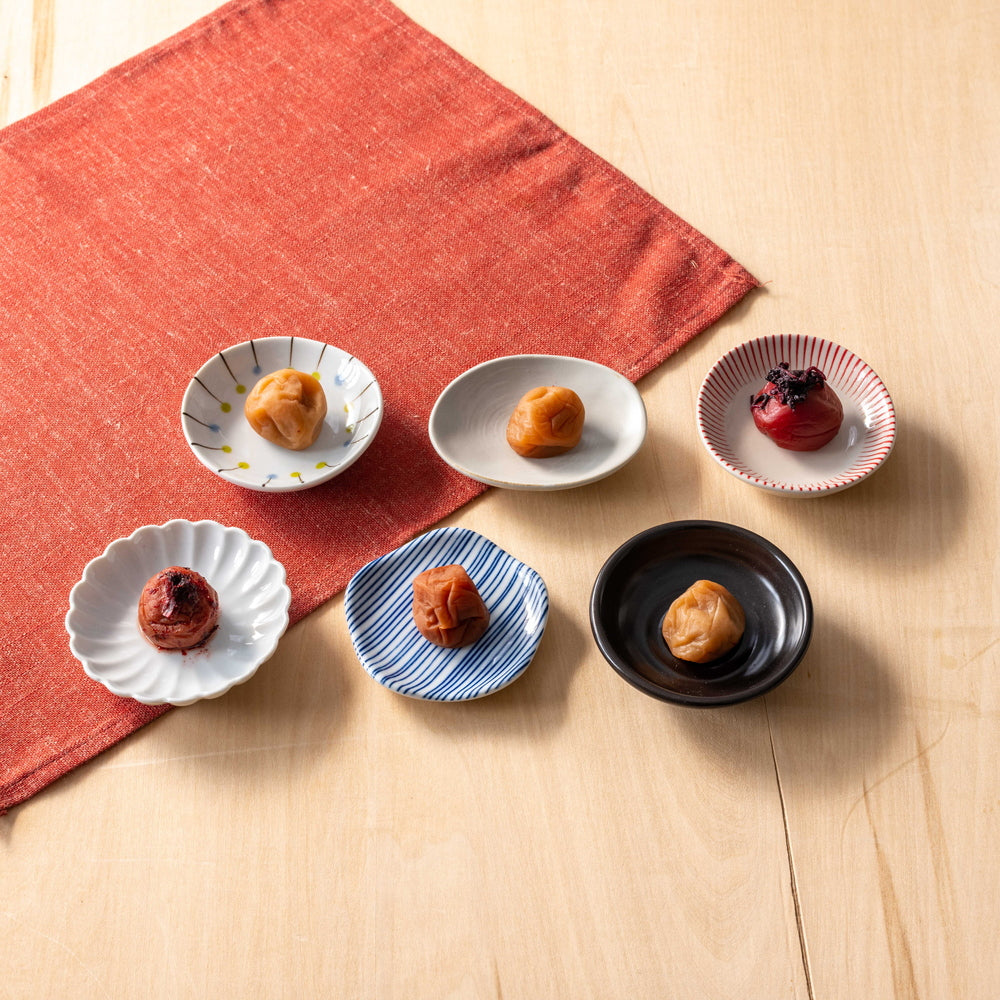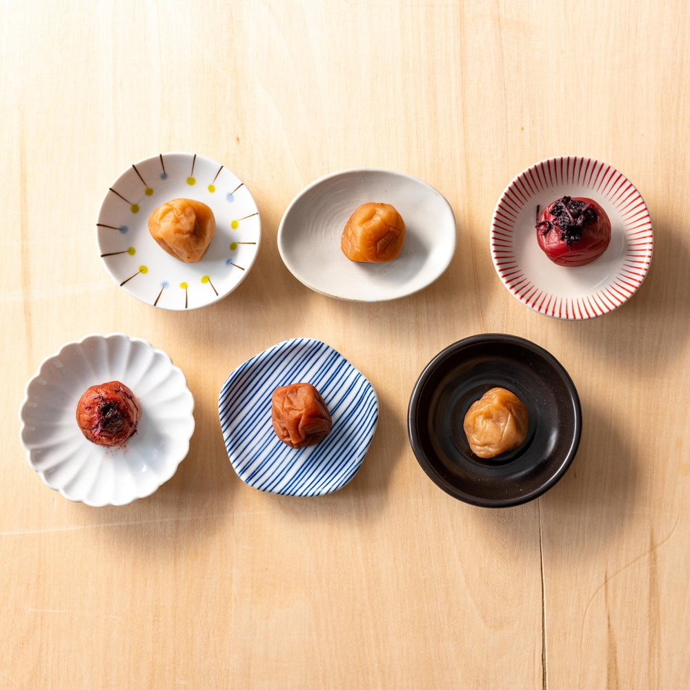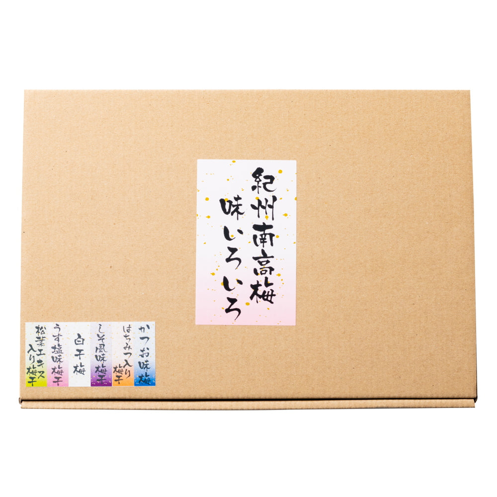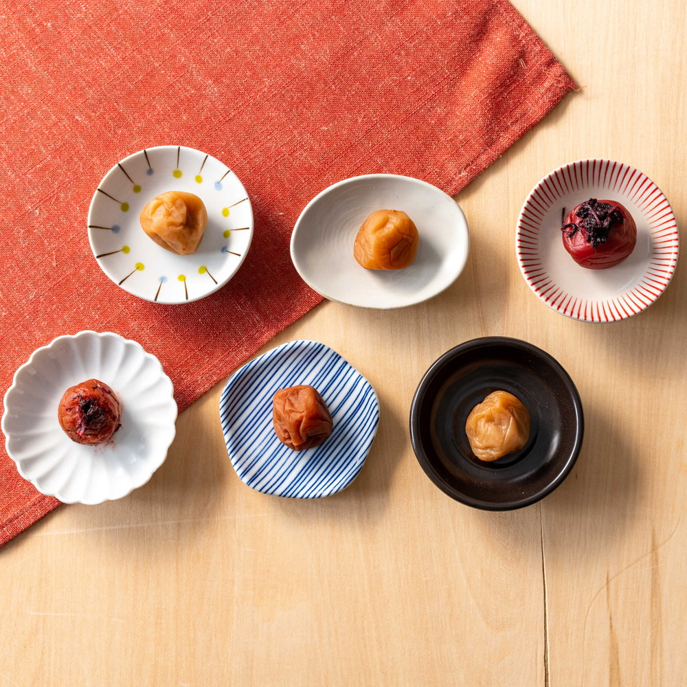 松葉エキス入り梅干(塩分約14%)・うす塩味梅干(塩分約6%)・白干梅(塩分約20%)・しそ風味梅干(塩分約8%)・はちみつ入り梅干(塩分約8%)・かつお味梅(塩分約14%) 各80g