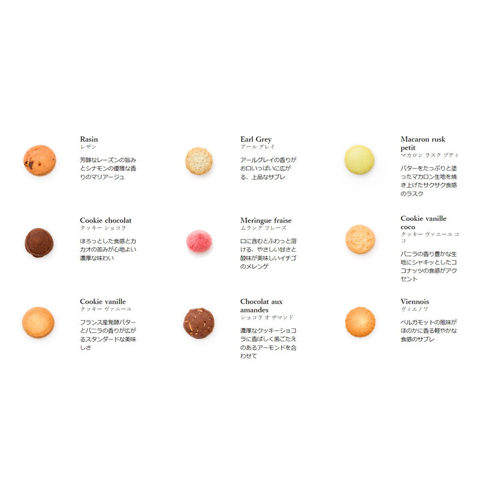 レーズンとシナモンを合わせた「レザン」、アールグレイの香りがお口いっぱいに広がるサブレ「アールグレイ」、甘酸っぱいイチゴを使ったメレンゲ「ムラング フレーズ」など、9種の味がお楽しみいただけます。