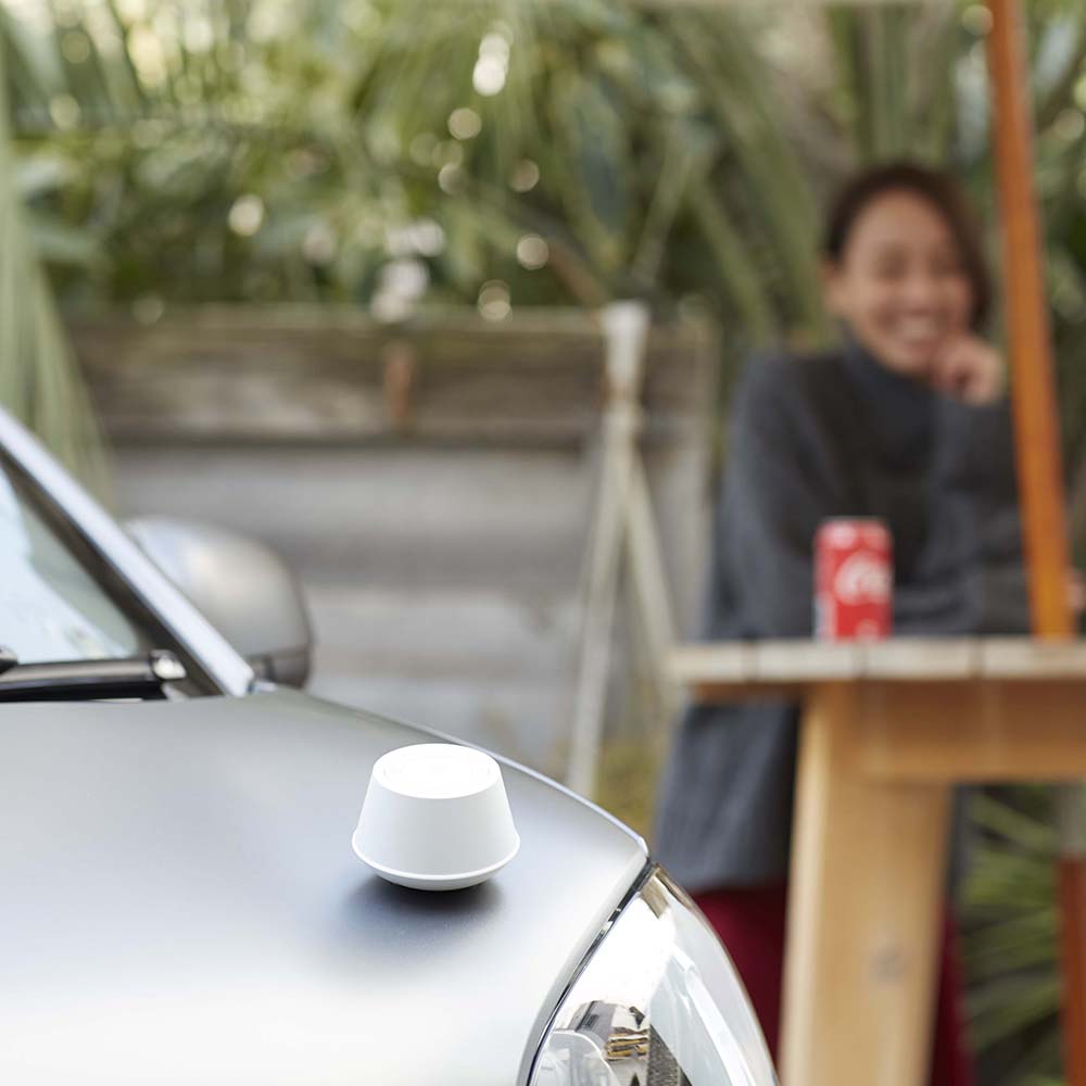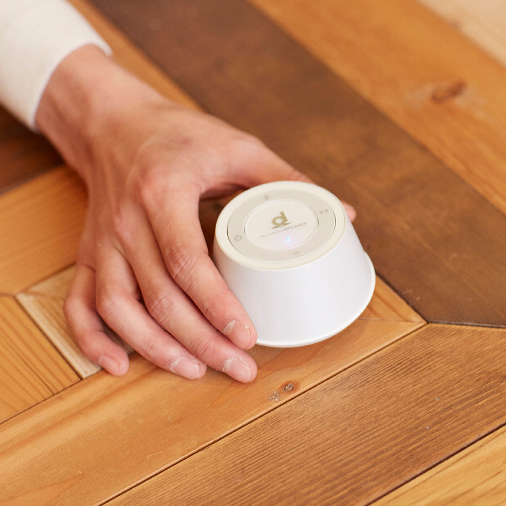 テーブル・椅子・キッチン・車体など置いた瞬間「どこでも」「いつでも」「なんでも」 対象物がパワフルなスピーカーに変わる。