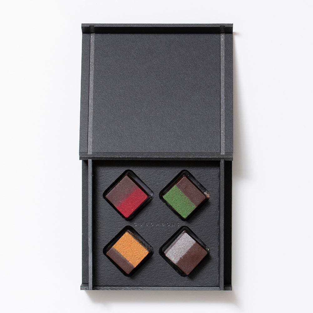 ■味わい深いリキュールが入った、キューブ型のボンボンショコラ4種セット。ウイスキー、ラム、テキーラ、日本酒を練り込んだ口どけなめらかなガナッシュと、ダークチョコレートの奥深さをお楽しみいただけます。 洗練されたデザインは、大切な方への贈り物や、ご自分へのご褒美にもぴったりです。 ※本品はお酒を使用しています。アルコール分:ウイスキー2.6%、ラム2.5%、テキーラ2.2%、日本酒1.2%