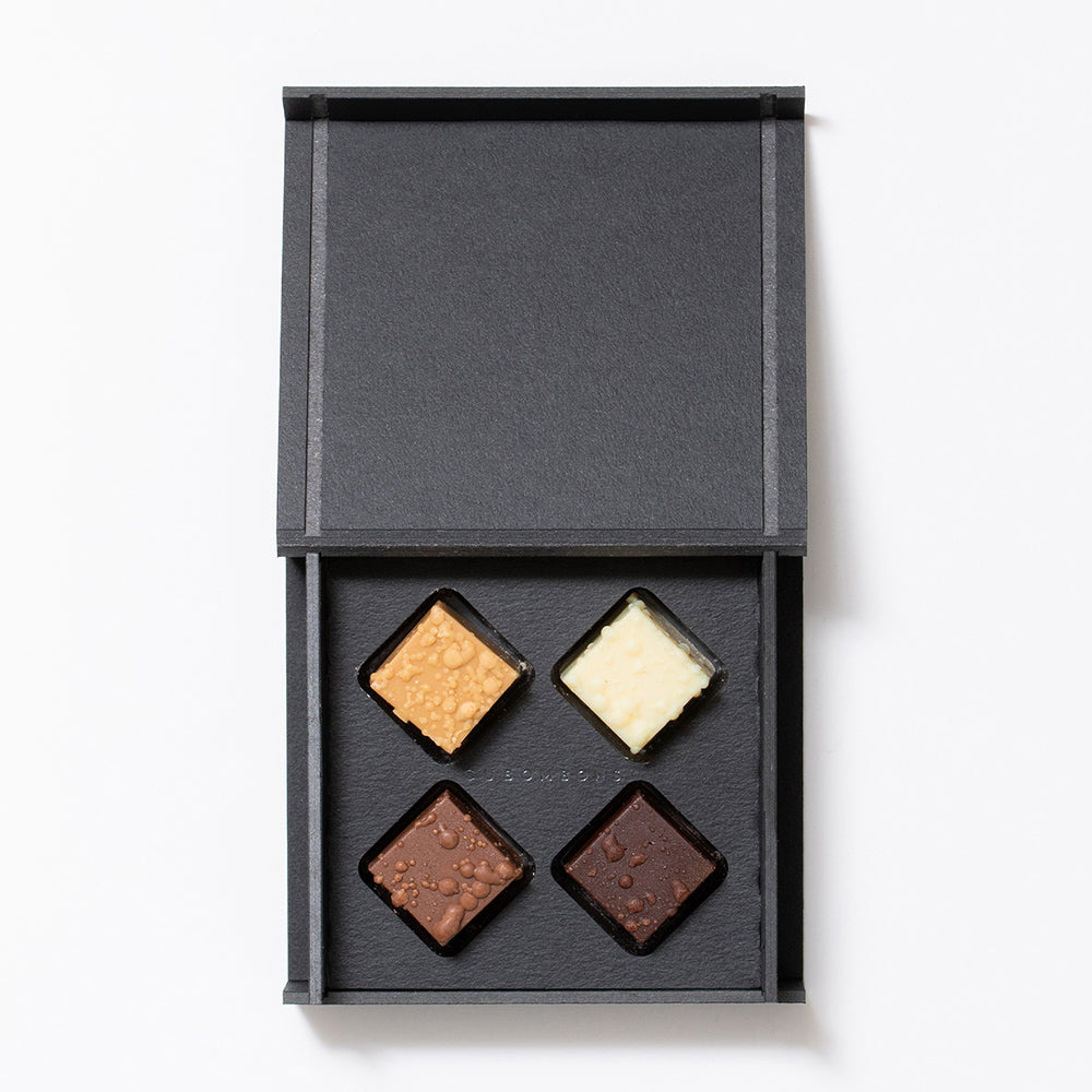 ■ナッツの豊かな風味を味わえる、キューブ型のボンボンショコラ4種セット。ピーカンナッツ、パインナッツ、ヘーゼルナッツ、アーモンドのプラリネを、それぞれ相性の良いチョコレートに混ぜ込みました。ザクザクとしたナッツの食感と、チョコレートの奥深い味わいをお楽しみいただけます。 洗練されたデザインは、大切な方への贈り物や、ご自分へのご褒美にもぴったりです。