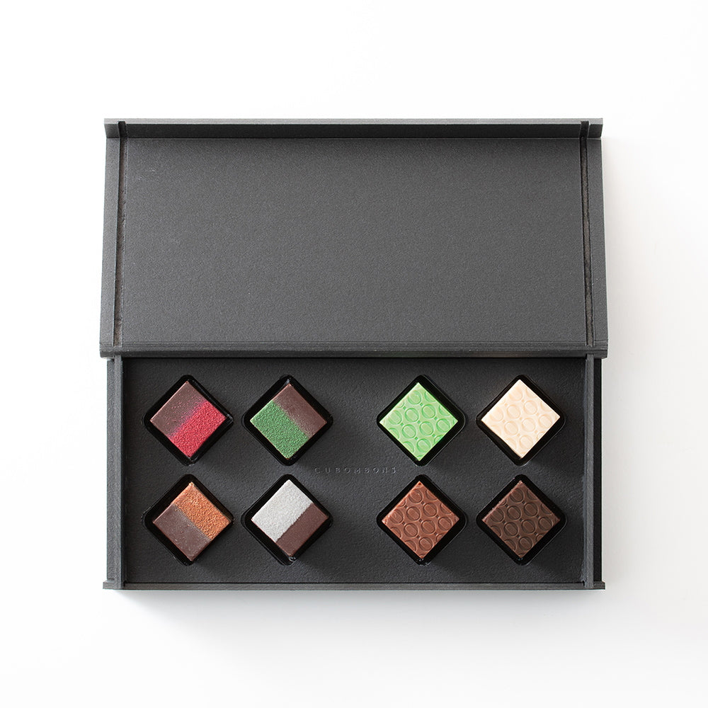 ■味わい深いリキュールが入った「ミニバー」と、コーヒーやティーの香りを楽しめる「インフュージョン」を組み合わせた、キューブ型のボンボンショコラ8種セット。 素材本来のナチュラルな風味を閉じ込めた、口どけなめらかなガナッシュと、チョコレートの奥深い味わいをお楽しみいただけます。 洗練されたデザインは、大切な方への贈り物や、ご自分へのご褒美にもぴったりです。 ※本品はお酒を使用しています。アルコール分:ウイスキー2.6%、ラム2.5%、テキーラ2.2%、日本酒1.2%