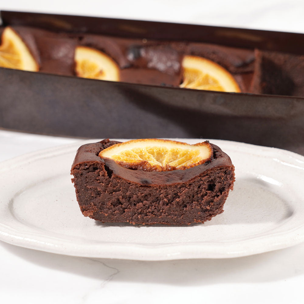 チーズケーキの生地の中にチョコレートを練りこみ焼き上げたショコラバスクチーズケーキにふわっと広がるオレンジの酸味、鼻に抜けるオレンジの香りが絶妙にマッチ。ショコラ、オレンジの間違いない組み合わせにカラメル風味が一層の深みを与えます。プレーンオレンジとの食べ比べをお楽しみください。