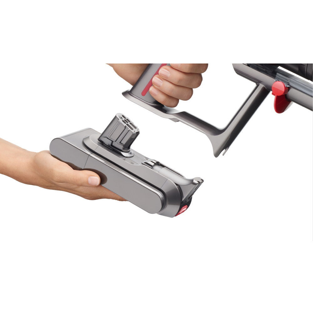 ボタンひとつで簡単に予備の着脱式バッテリー(別売)と交換でき、より長時間の掃除にも対応します。また、バッテリーを本体に取り付けたままでも、取り外しても充電できます。