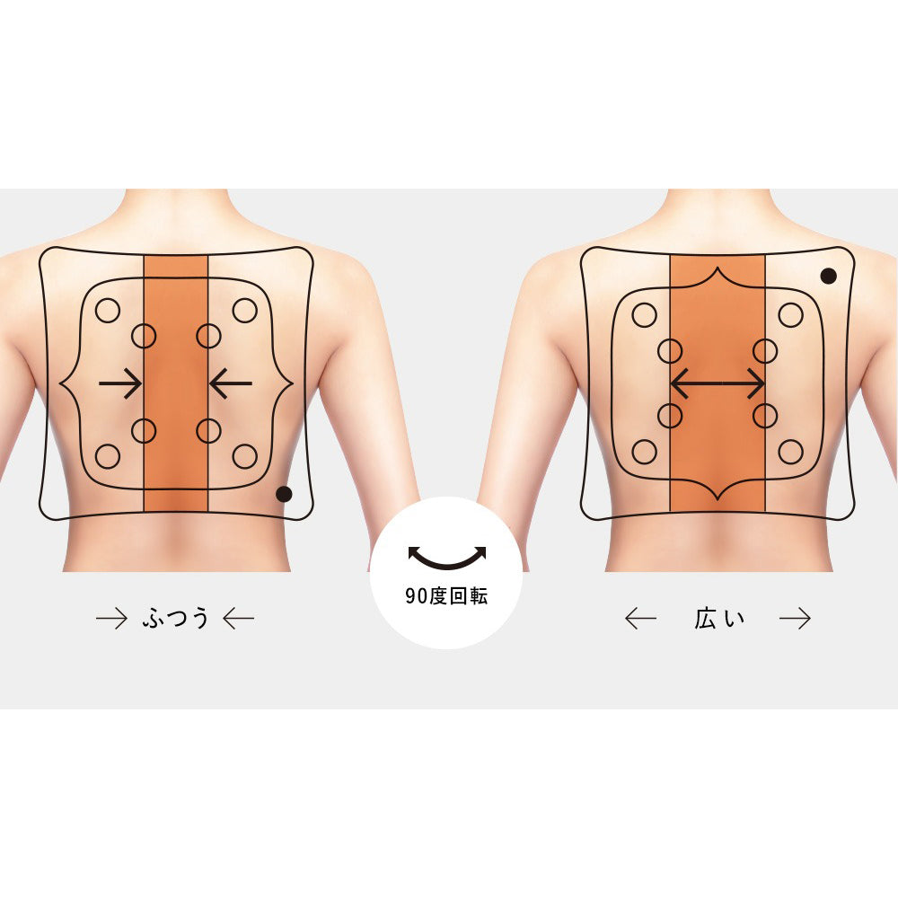 そのまま使えば脊柱起立筋をマッサージ。90度回転させると3cmもみ幅が広がり、広背筋や肩甲骨まわりを狙えます。