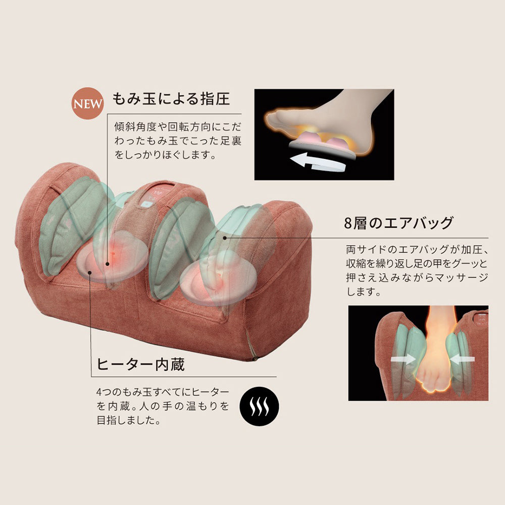 傾斜角度や回転方向にもこだわったもみ玉で、こった足裏をしっかり指圧しながらもみほぐします。人の手で緩急をつけたよりリアルなもみ心地「プロもみ」とヒーターを搭載しプロが指圧する心地よさを追求しました。また、両サイドの8層のエアバッグは、加圧と収縮を繰り返し、足の甲をグーッと押さえ込みながらつかむようにマッサージします。足うらコース、ふくらはぎコースがあり、足全体をトータルケアできます。