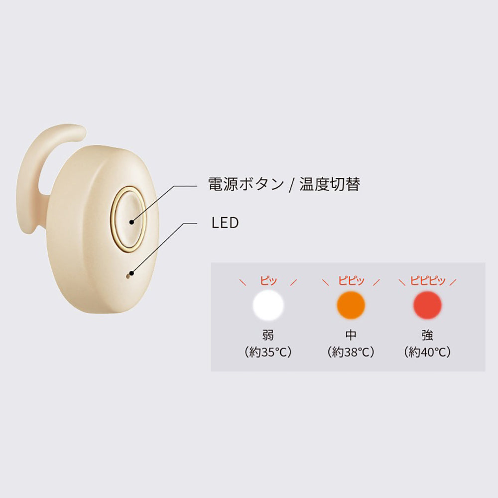 電源ボタンを押すたびに 弱→中→強と温度とLEDの色が切り替わります。約35℃〜40℃で心地よい温度で耳の中を温めます。