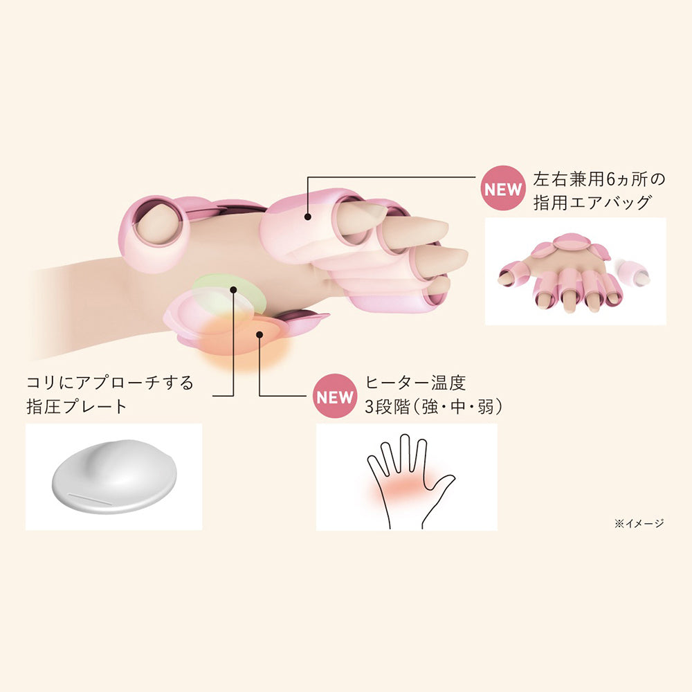 指を1本ずつ包むグローブ型のハンドマッサージャーにコードレスタイプが新登場。内蔵の指圧プレートで手全体の血行をよくして、筋肉の疲れを取ります。指用エアバッグが2ヵ所増え、すべての指を同時にマッサージできるようになりました。ヒーターは強・中・弱の3段階に切替でき、ヒーターだけでも使用できます。