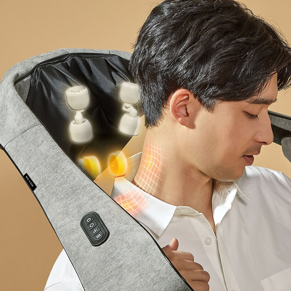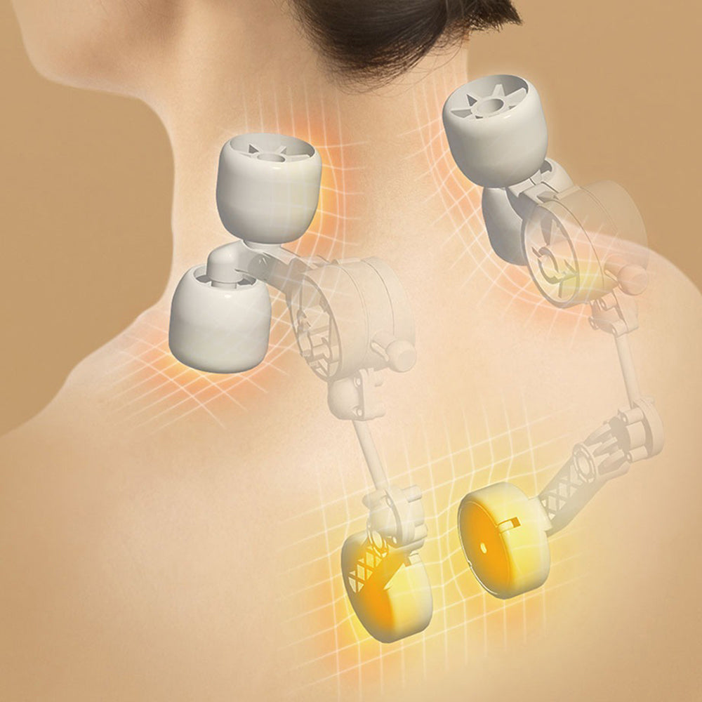 独自設計の4つのもみ玉が首をはさんでもむコードレスネックマッサージャーが登場。また、ヒーター付きのローラーが背中の筋肉もカバー。しっかりもみほぐし、優しく背中をさするようなマッサージで癒されます。