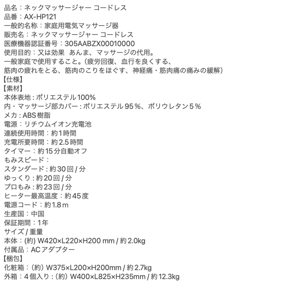 アテックストール ネックマッサージャー コードレスAX-HP121