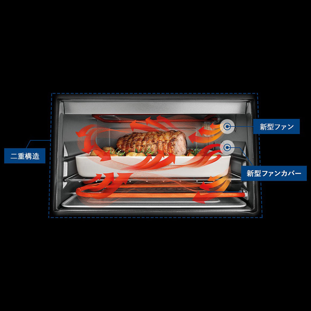 ■コンパクトなのにパワフル。コンベクション機能を最大限に引き出すサラウンドコンベクションシステム搭載。熱風が庫内の隅々まで行き渡り、ムラなくおいしく焼きあがる、コンパクトなのに頼れる失敗知らずのコンベクションオーブン。