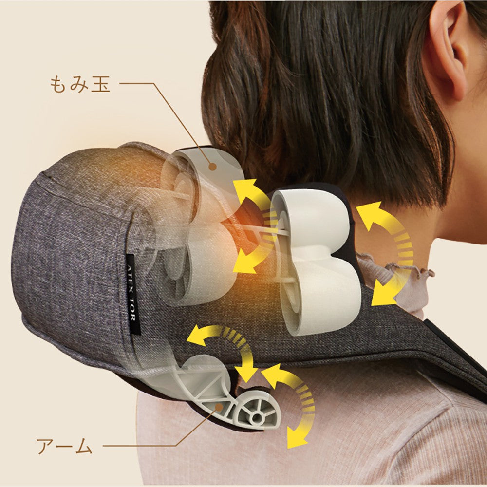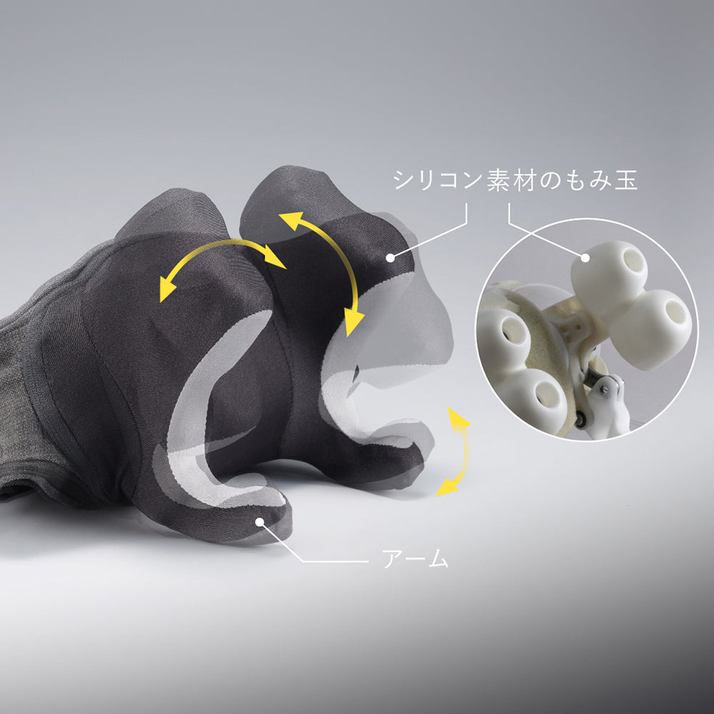弾力がありフィット感の良いシリコン素材のもみ玉と下に突き出た大きなアゴのようなアームで、首・肩と背中を同時にもみほぐします。