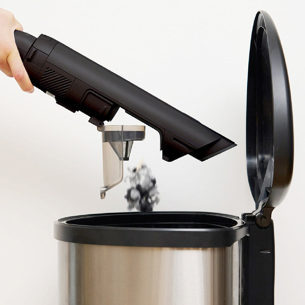 手元のボタンを引くだけでダストカップが開き、ゴミ捨てができます。力を入れることなく、簡単にサッとゴミを捨てられます。