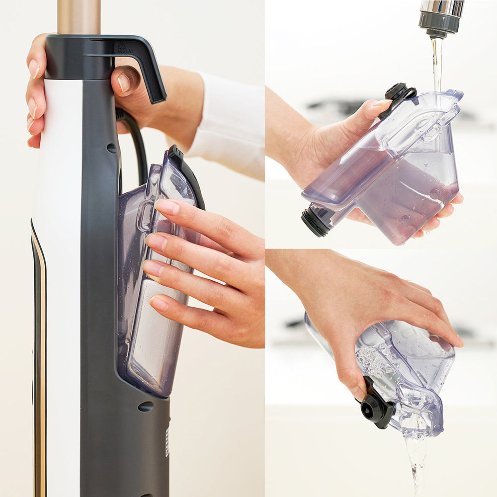 本体から給水タンクが取り外せるので、タンクと一体型になっているモップと比べて、簡単に給排水が可能です。