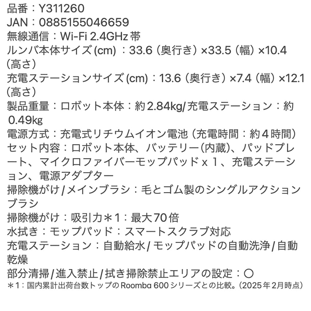 *1:国内累計出荷台数トップのRoomba 600シリーズとの比較。(2025年2月時点)