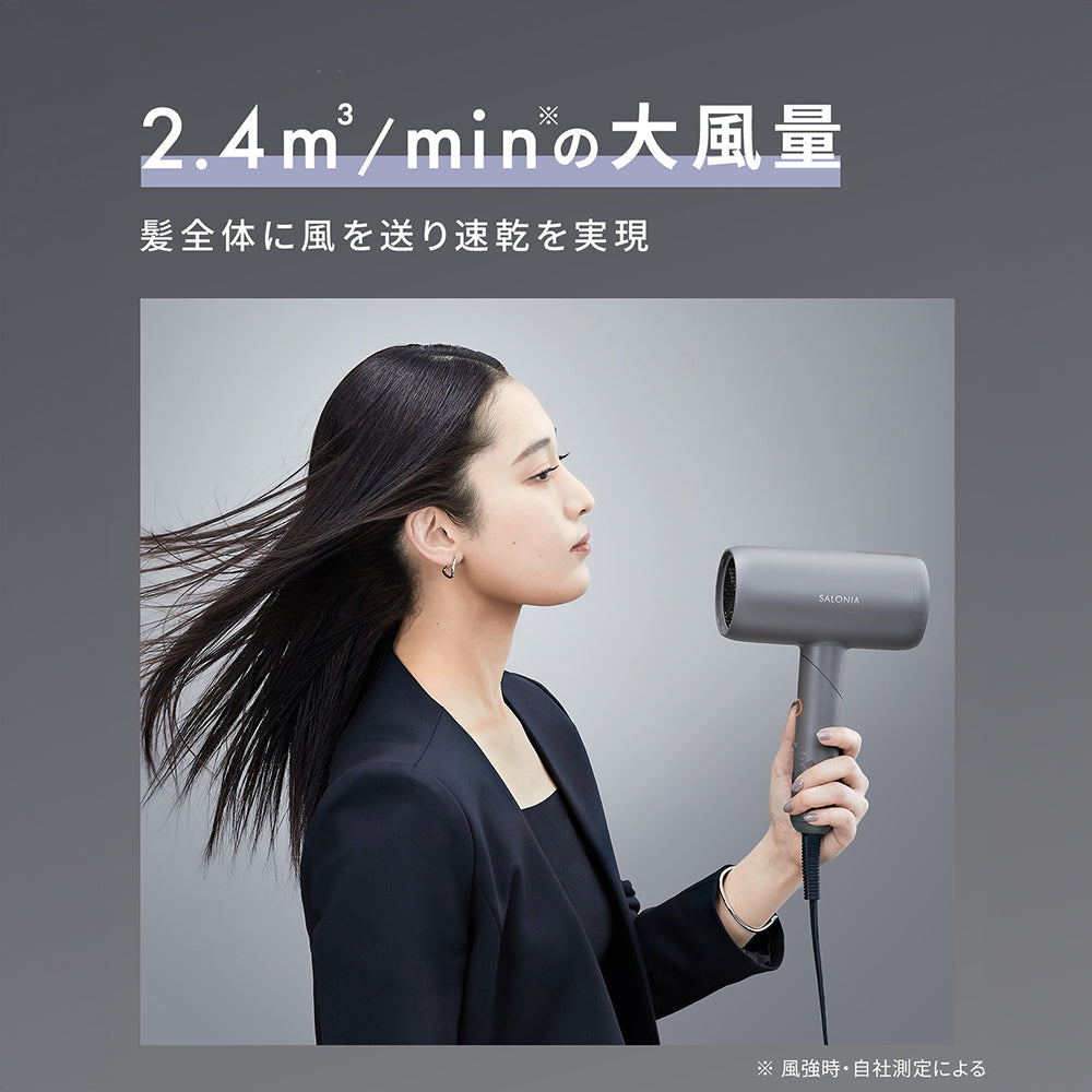 2.4m2/min※の大風量と吹出口の形状を変えることで、風の当たる面積を広げ、低温なのに速乾を実現。熱によるダメージを軽減し、ツヤめくシルク髪へと導きます。