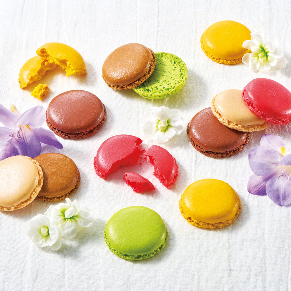 マカロンの生地を2度焼きし、サクサク食感に仕上げました。しっかりとした歯ごたえとともに、アーモンドの香りがふわっと広がります。