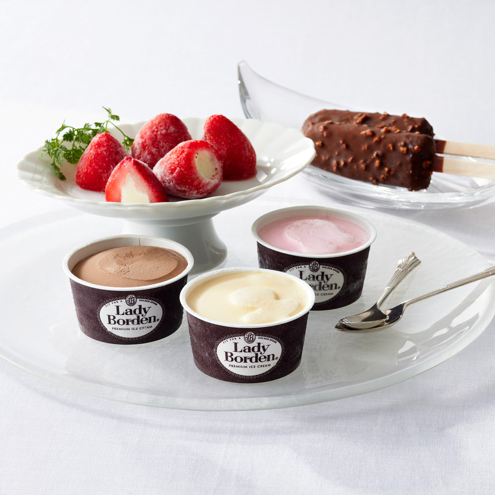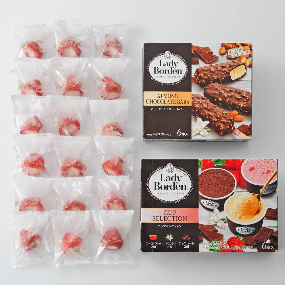 ■「食べる宝石」と言われる苺をそのままに。新鮮な苺の芯を丁寧にくり抜いて相性抜群の練乳と生クリームを使ったアイスを絞り入れた苺アイスと、レディーボーデンの2種類(アイスバー・カップアイス)のマルチパックを詰合せました。