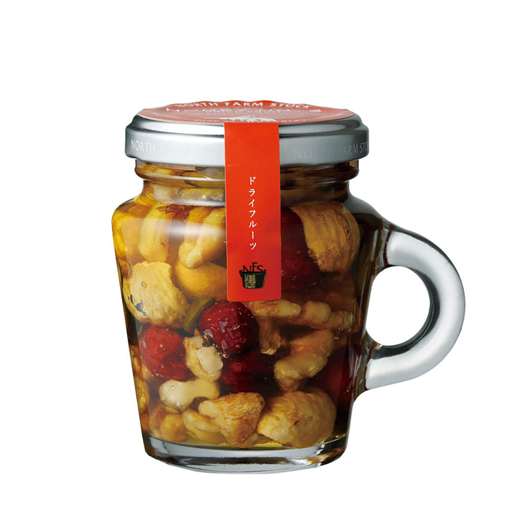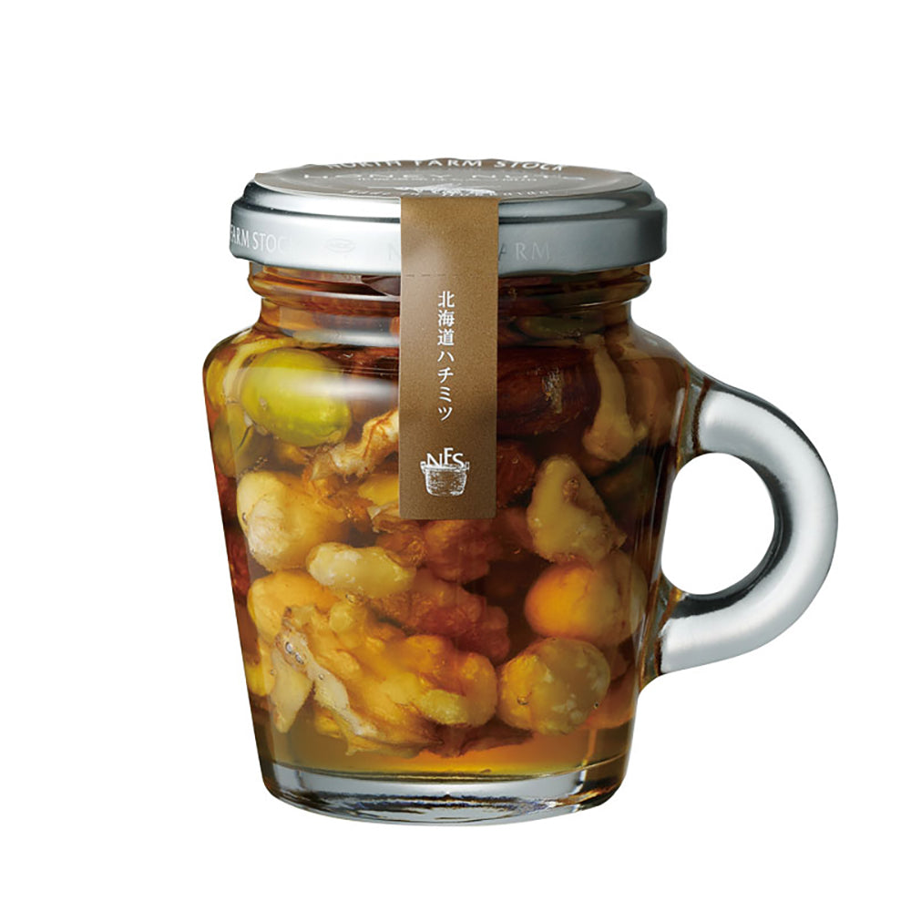 香ばしいローストナッツと甘酸っぱいドライフルーツを香り高い北海道産はちみつに漬け込みました。