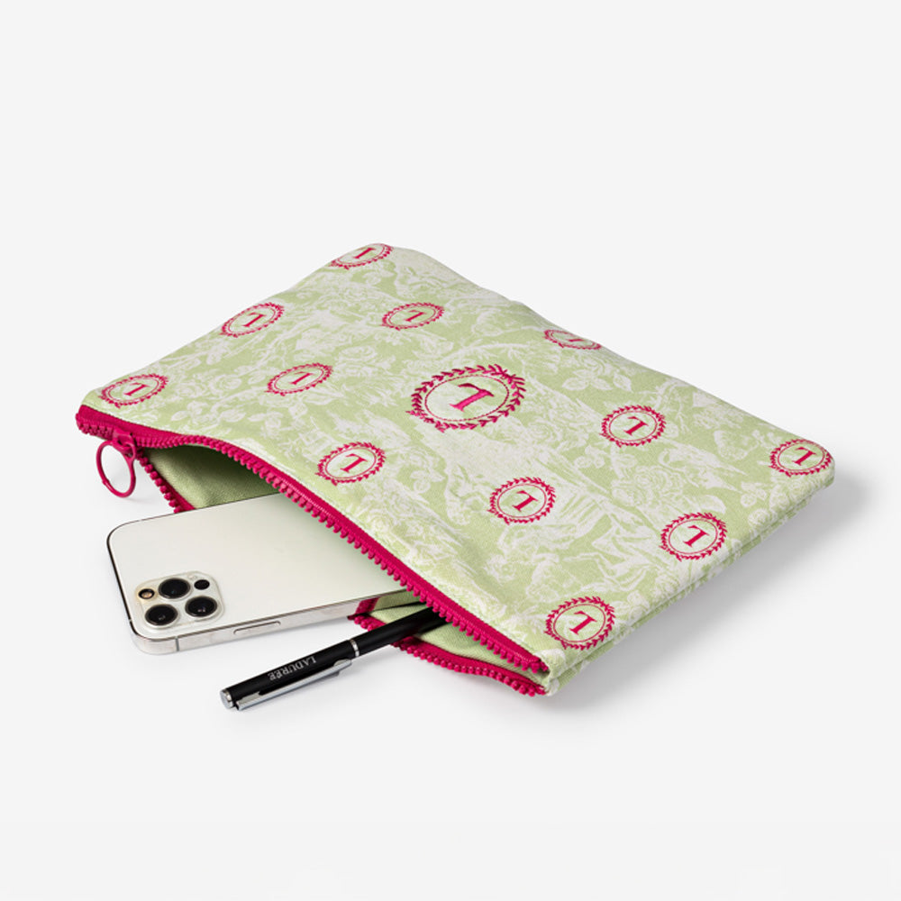 ■ポーチに、メゾンの大きなインスピレーションである王妃マリー・アントワネットへオマージュを込めた、トワル・ド・ジュイのパターンを施しました。