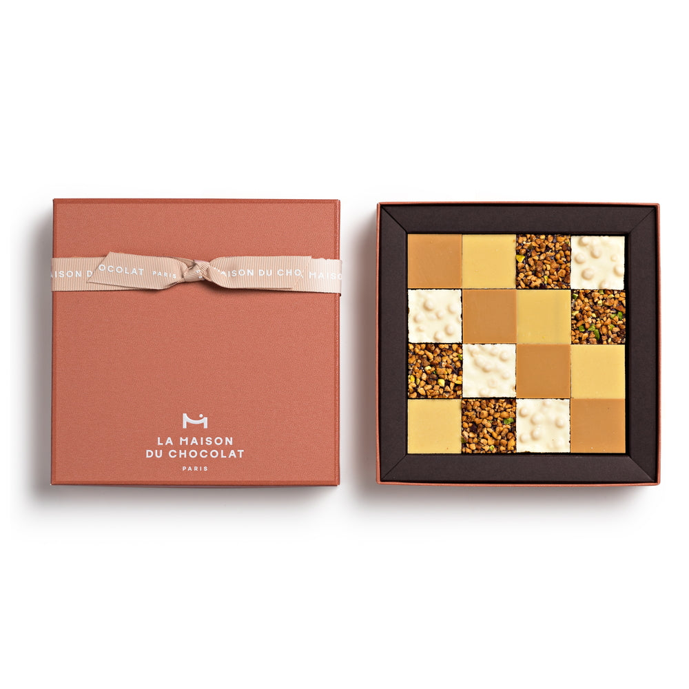■メゾンの人気のタブレット、サントノレ・チュイルリー・サンジェルマン・モンテーニュの4種のタブレットを正方形にカットしボックスに詰合せました。