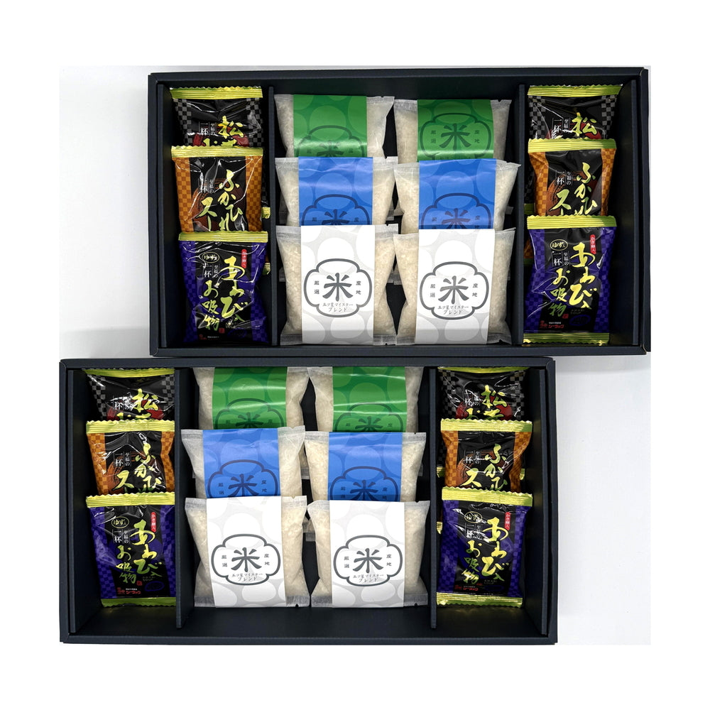 セット内容:新潟県産コシヒカリ1合(約150g)x4/新潟県産こしいぶき1合(約150g)x4/ブレンド米1合(約150g)x4/松茸のお吸物4.2gx4/ふかひれスープ5.5gx4/あわび入お吸物4gx4