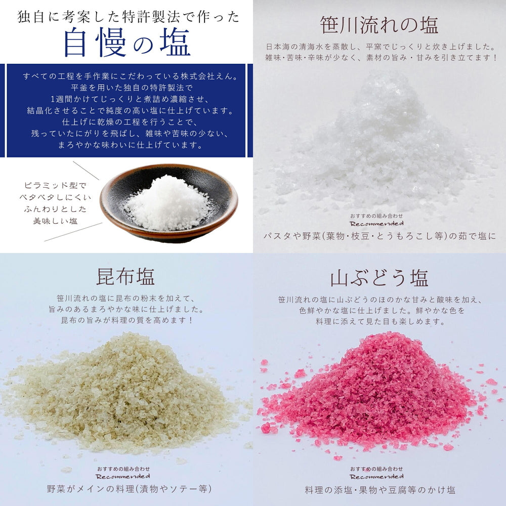 セット内容:新潟県産コシヒカリ1合(約150g)x12/魚沼産コシヒカリ1合(約150g)x3/笹川流れの塩20gx1/山ぶどう塩20gx1/昆布塩20gx1/藻塩20gx1/藻昆布塩20gx1