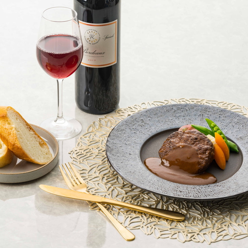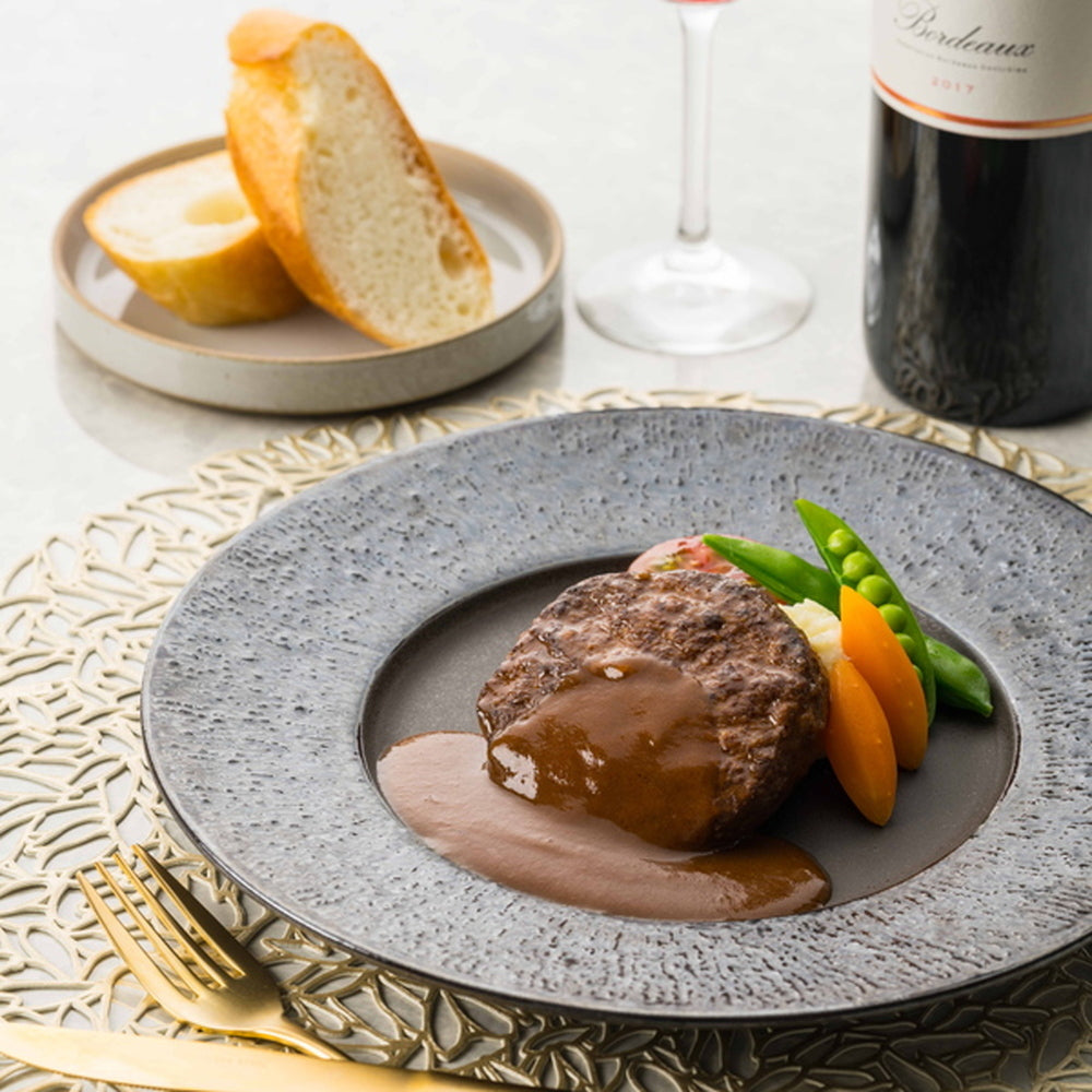 ■レストランリューズ飯塚隆太監修。 赤ワインとトマト、バターで奥深い味わいに仕上げたデミグラスソースに、 温めたときにジューシーさが残るよう軽く焦げ目をつけて焼いたハンバーグを閉じ込めました。レンジアップでお召し上がりいただけます。