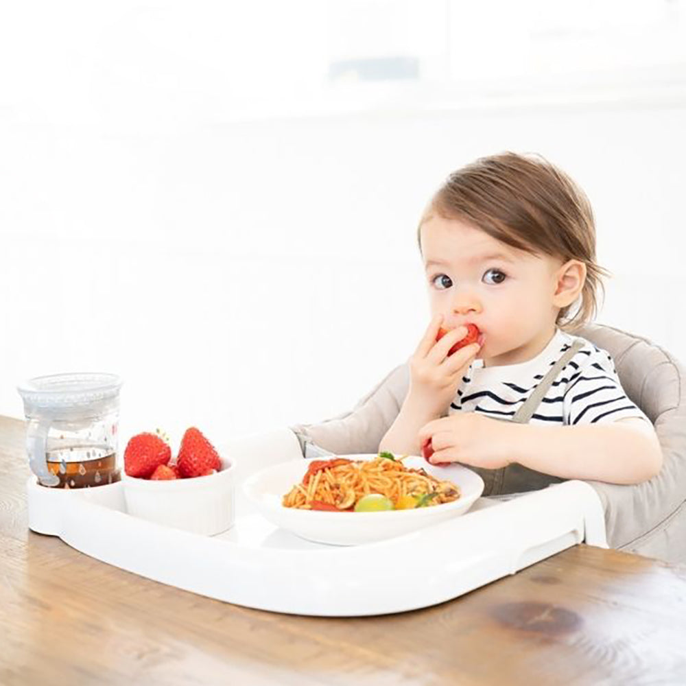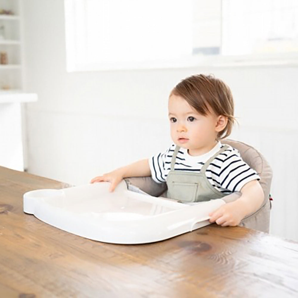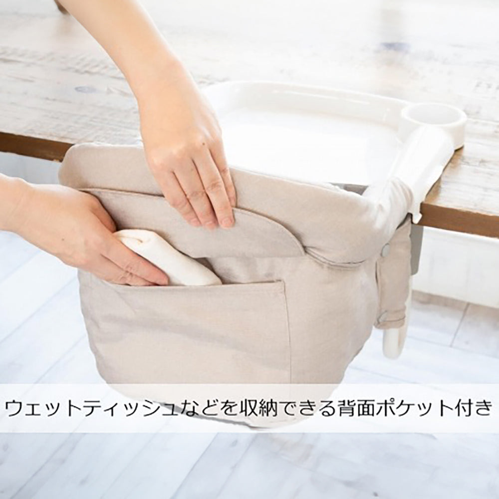 付属の専用トレーはドリンクホルダー付でコップの転倒を防止。トレーのフチが立ち上がっているので汁物をこぼしても広がらず、外して水洗いできるのでお食事の後片付けが簡単です。また、シートも取り外してお洗濯できるので、いつでも清潔にご使用頂けます。