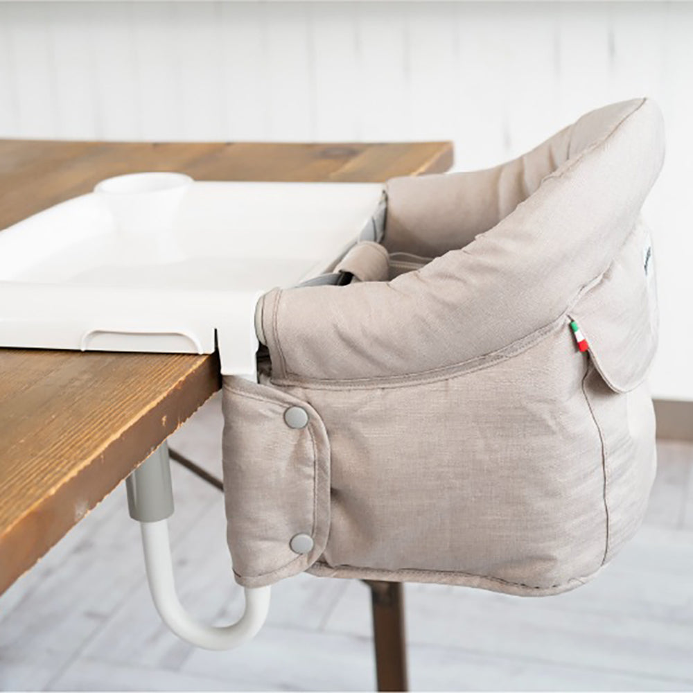テーブルの天板を挟んでアームを回転させるだけで様々なテーブルに簡単に固定して使用できます。股ベルト・腰ベルトでお子さまをしっかりホールド。腰すわり~3歳頃まで長くご使用頂くことができます。