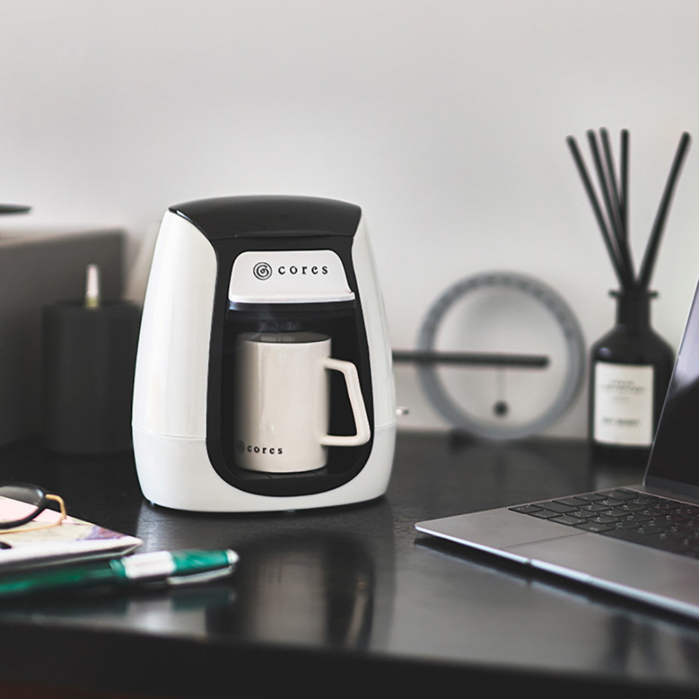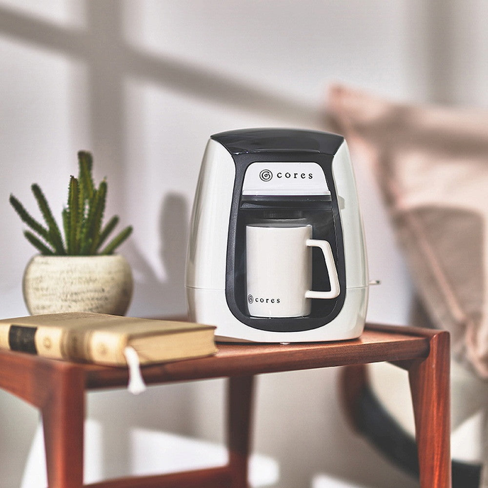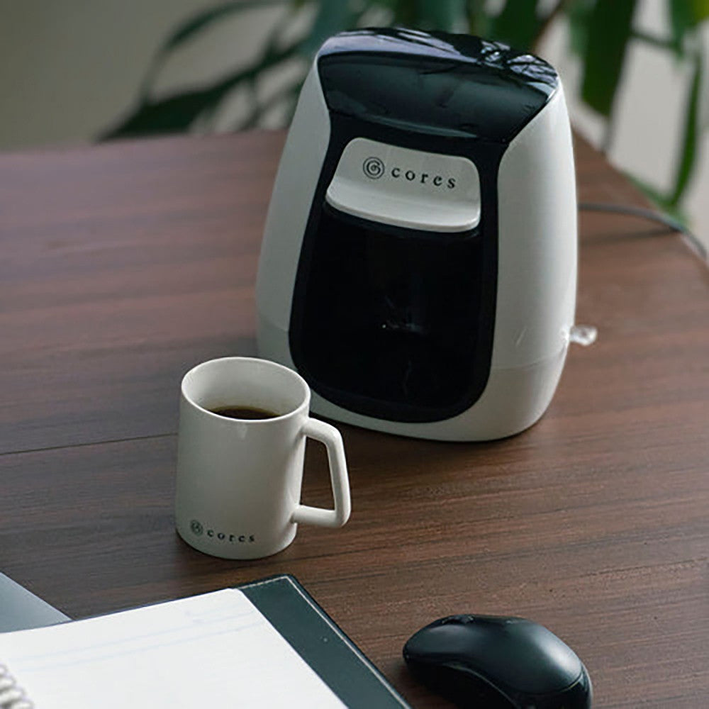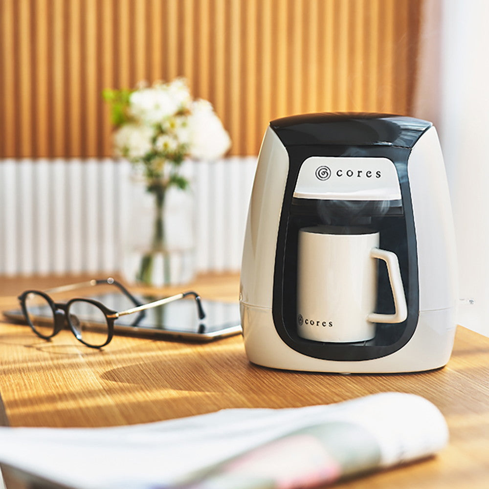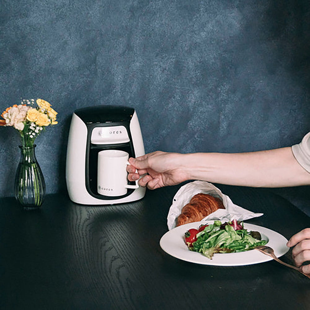 場所を取らないコンパクトサイズで、オフィスの自分のデスクや、寝室のサイドテーブルにも置ける大きさです。付属の陶器製マグカップに直接コーヒーが注がれるので、本体のそばに水とコーヒー粉を置いておけば、部屋にいながら淹れることができます。