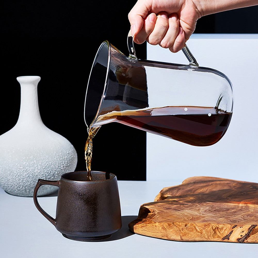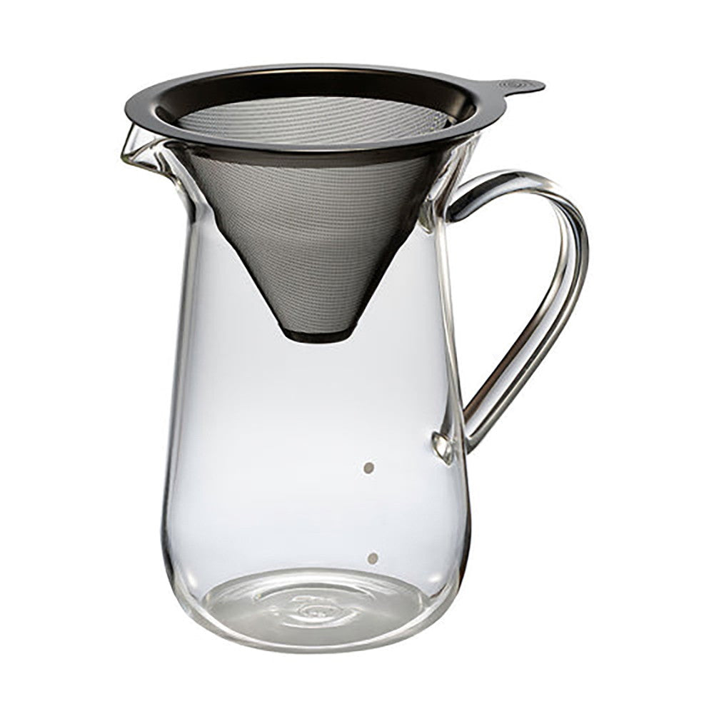 くびれ部分の内径が約8cmと大きいため、お手入れがしやすく、大きなハンドルで持ちやすいサーバー。また、ドットは抽出量の目安としておおよそ250mlと500ml を示しています。大きさは適度に余裕があり、中に氷を入れてアイスコーヒーを抽出することも容易です。