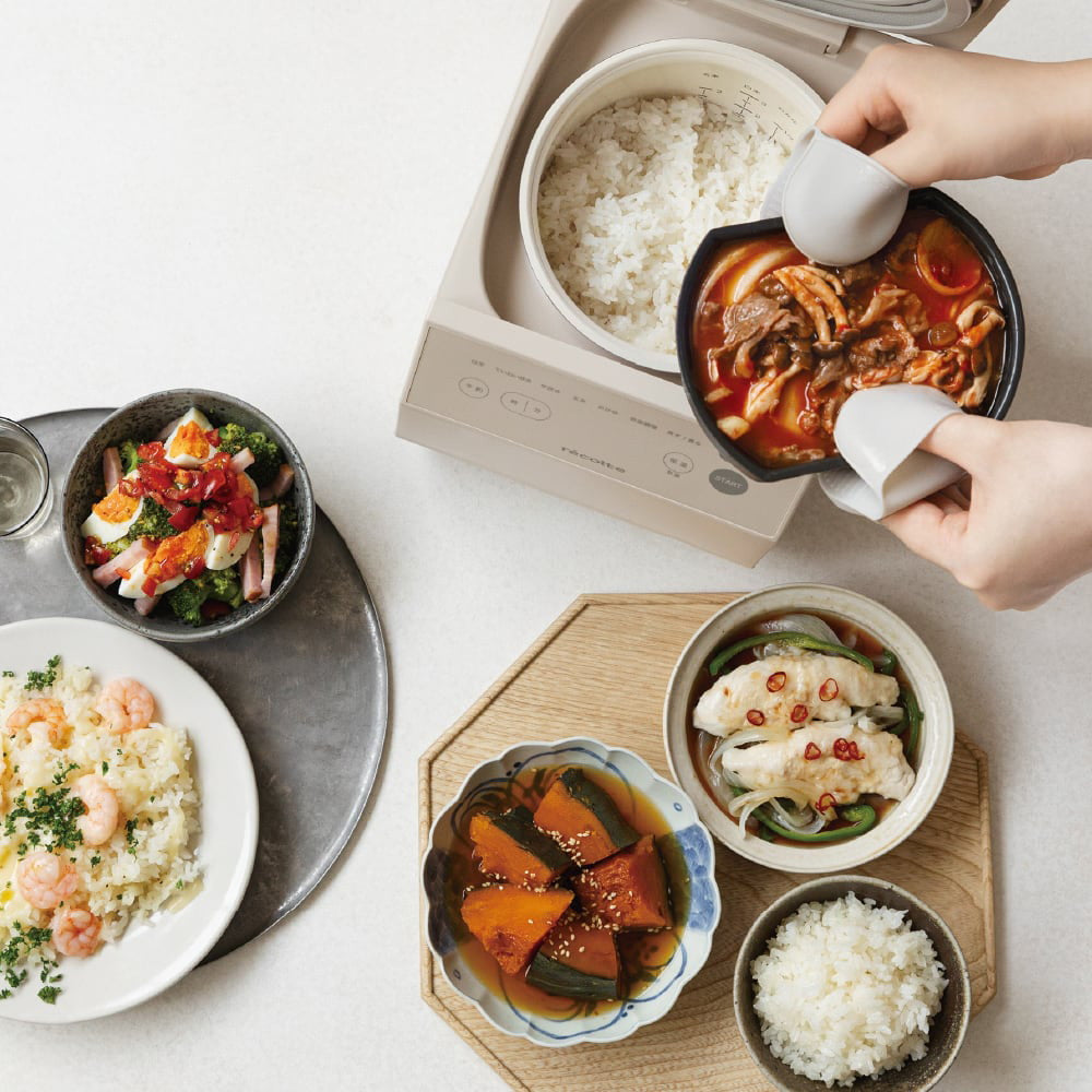 上下2段で同時調理できるから、「ごはん+おかず」も「おかず2品」も。炊飯器におまかせで、ラクラク時短クッキング!