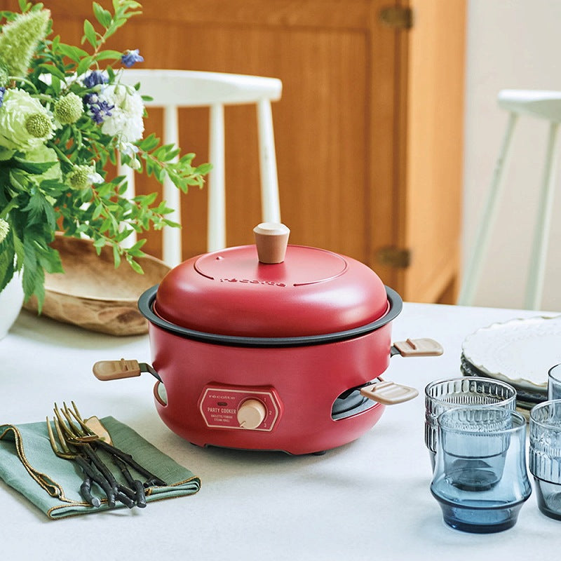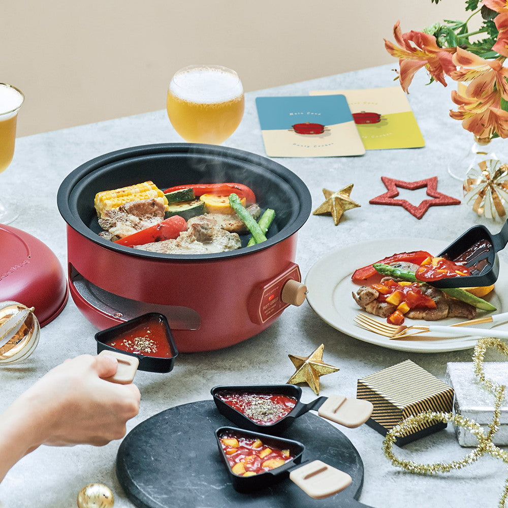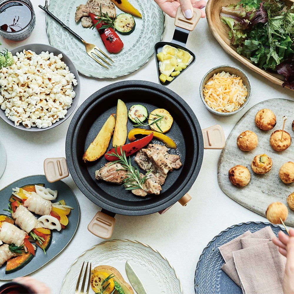 ■みんなが集まるテーブルの真ん中に[パーティークッカー]があれば笑顔があふれ出す![プレート]でメインディッシュを調理しながら、[ミニパン]でチーズを溶かす、ソースを温める、[ココット]でフォンデュやバーニャカウダを楽しむなど、アイデア次第で使い方いろいろ。ホームパーティーはもちろん、デイリーにも使いやすい卓上調理器です。