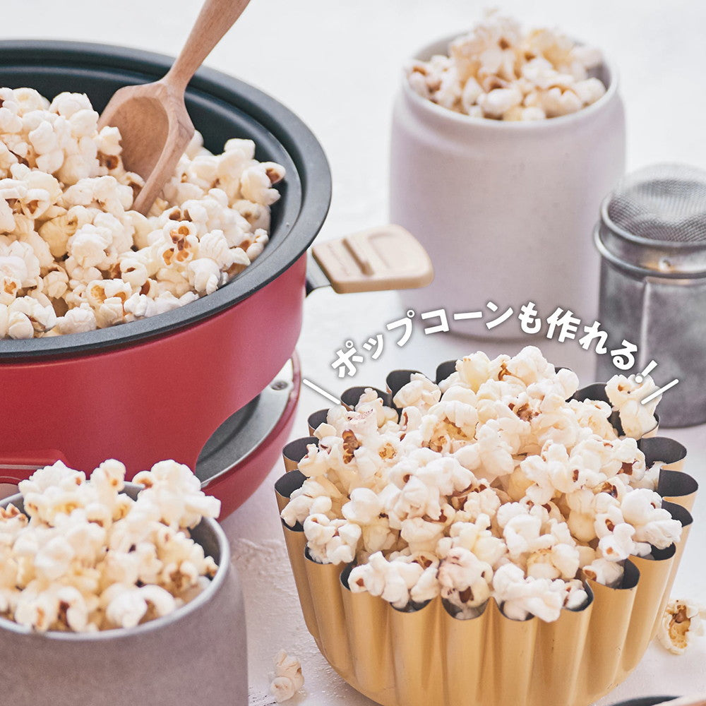 メインディッシュを作る[グリルプレート][タコヤキプレート]、ソースやチーズを温める[ミニパン]の他、[蒸し料理用アミ][ココット]など、付属のパーツが充実。パーティーが盛り上がるポップコーン作りもテーブルで簡単に。